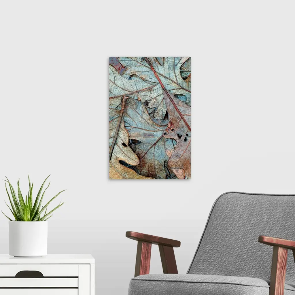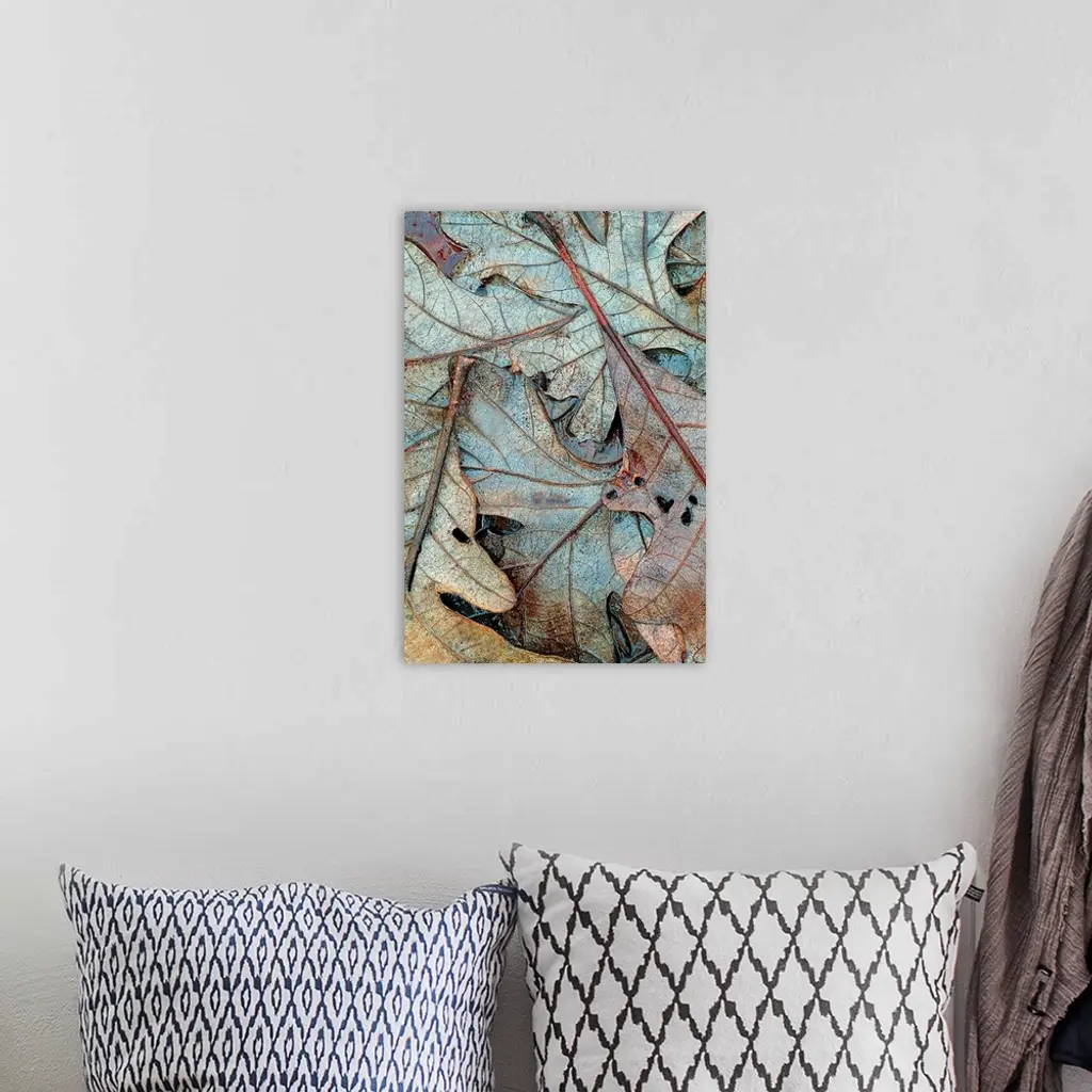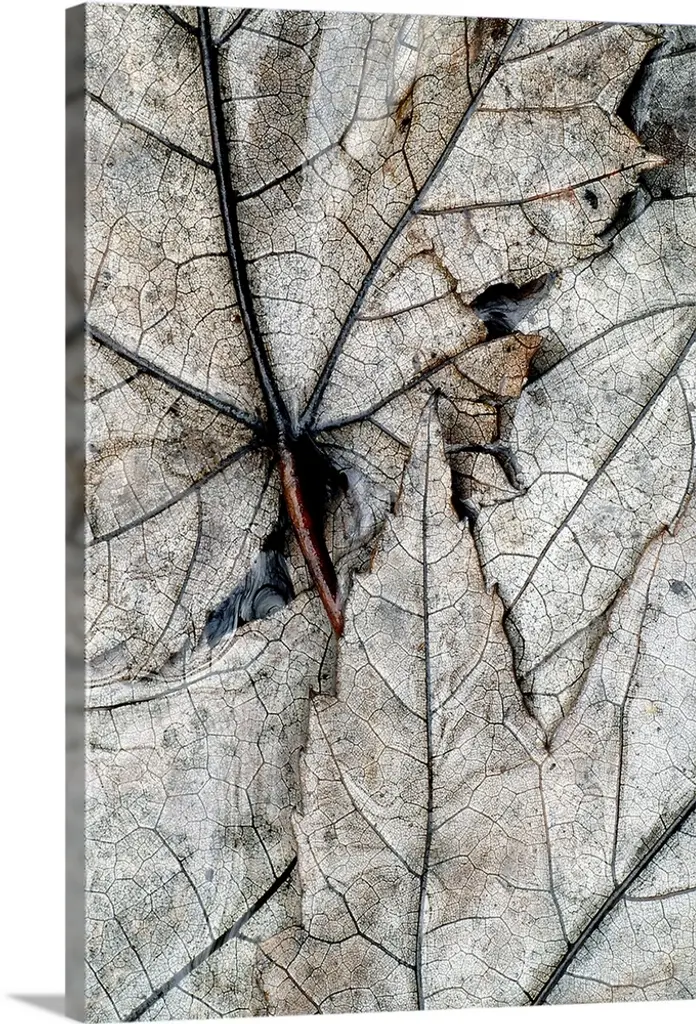 Up-close vertical panoramic photograph of soaked leaves showing their outline and veins.