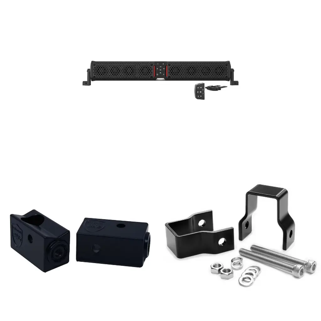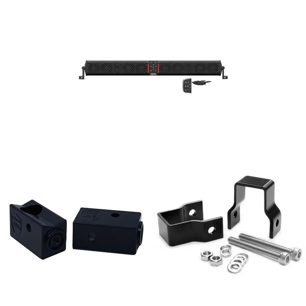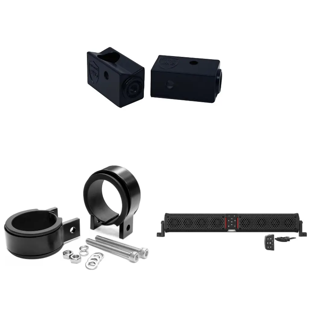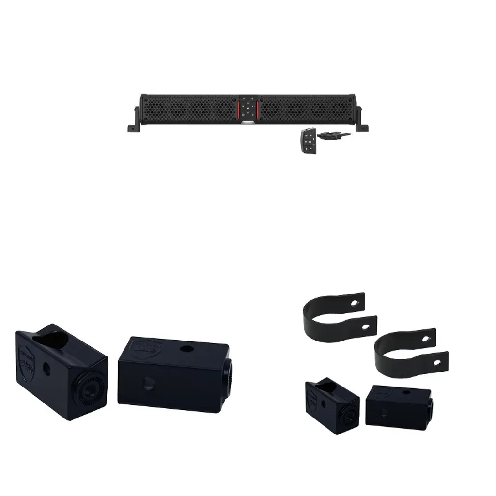 This bundle features essential accessories for your Wet Sounds Stealth sound system. It includes a Wet Sounds Slider Bracket for STEALTH Sound bars, a Wet Sounds STEALTH XT 8-B All-In-One 300-Watt Amplified Bluetooth 8-Speaker Soundbar With Remote in Black, and a Wet Sounds ST-ADP-RND 1.75" Stealth Adapter-Round. The Slider Bracket allows for easy mounting and adjustment of your Stealth sound bars, providing versatility for installation on various surfaces. The STEALTH XT 8-B soundbar is a powerhouse with a 300W Class-D DSP Amplifier, built-in Bluetooth connectivity, backlit touchpad controller, and RGB accent lights with 12 color modes. Its compact dimensions of H: 3.85" x W: 4.04" x L: 26.85" make it ideal for outdoor marine and powersports applications. Key Features: - Bluetooth Connectivity with Source Control - 300W Class-D DSP Amplifier - Built-In LED Dome Light and RGB Accent Lights - Fast Track Sliding Mount System - IP67 Weatherproof Rating - Sync Multiple Soundbars for Enhanced Audio - Integrated Power/Ground Wire Harness - Universal L-Brackets and Spacers Included - Auxiliary Input for Wired Connections - In-Line Fuse for Safety Specifications: - Dimensions: H: 3.85" x W: 4.04" x L: 26.85" - Built-In Amplifier: 300W Class-D DSP - Operating Voltage: 10V - 16V - Max Current Draw: 15A - Frequency Response: 40Hz - 20kHz - IP Rating: IP67 (Dustproof and Waterproof) - Control Panel: LED Backlit with Remote Control - LED Lighting: Integrated Dome Light, RGB with 12 Color Modes Enhance your audio experience with the Wet Sounds bundle, designed to deliver premium sound quality and durability for your outdoor adventures.