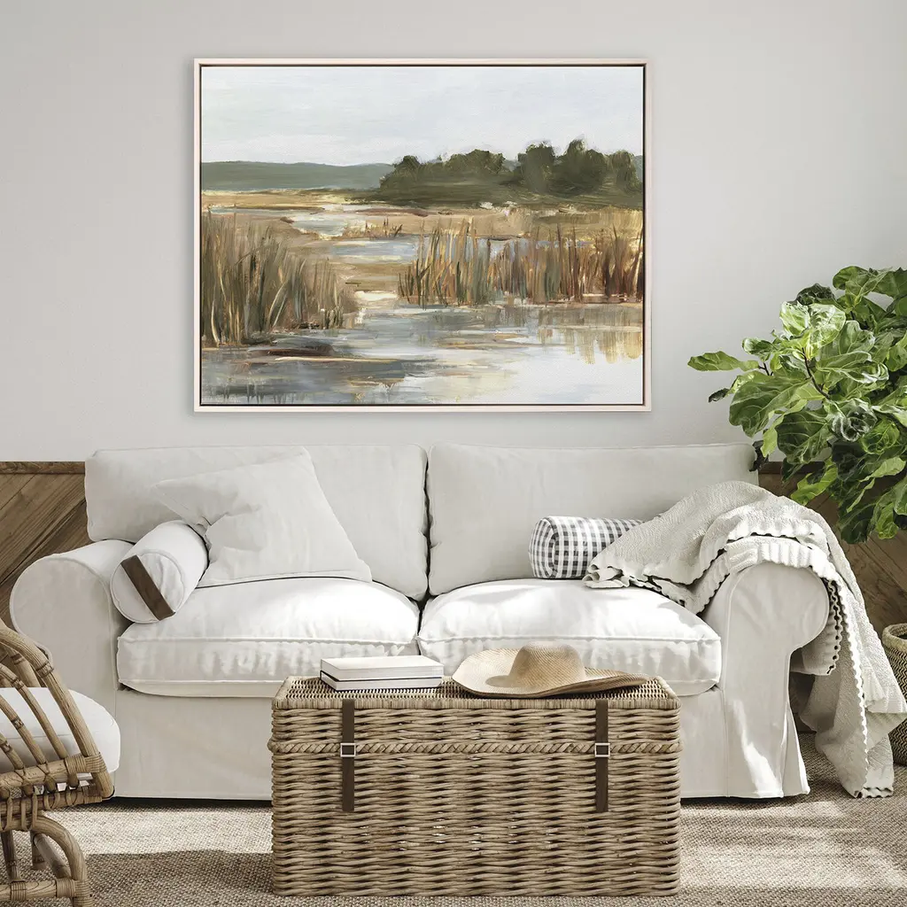 A marsh landscape yields a tranquil vista for escape. Canvas is wrapped around wood stretcher bars and mounted in a whitewash wood floater frame.