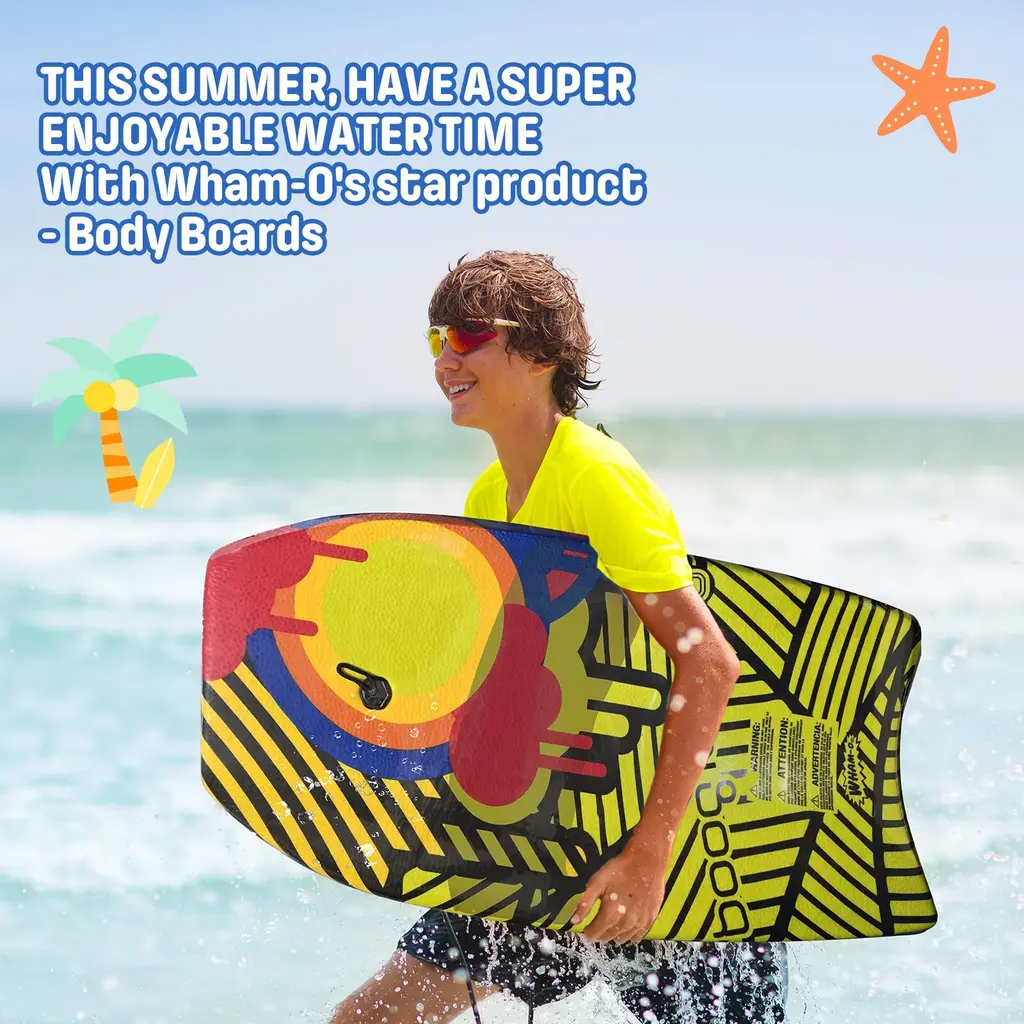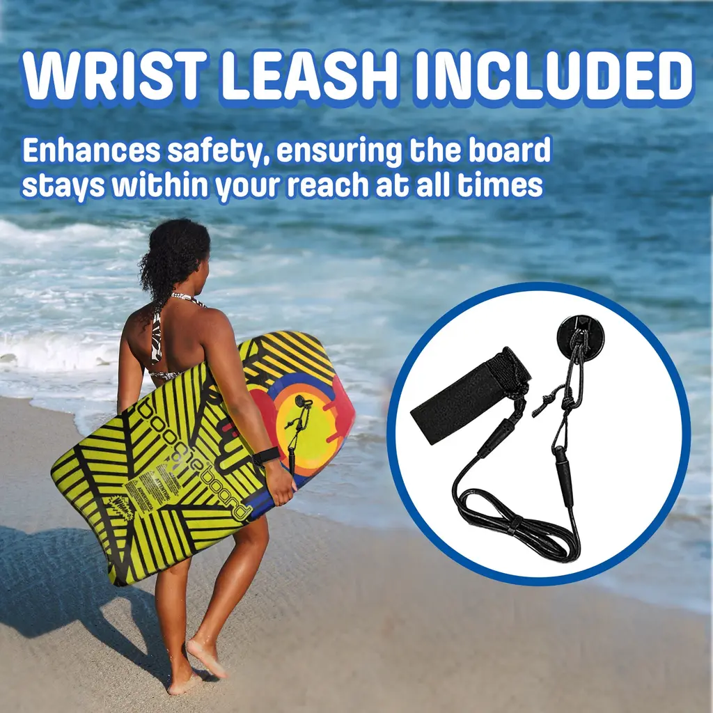 PREMIUM DESIGN – Crafted for both beginners and experienced surfers, this 37" fiber-clad covered bodyboard provides optimal speed and stability in waves for endless fun and unforgettable experiences on the water. DURABLE CONSTRUCTION – Built with a Phuzion Core (high-density EPS core), this stylish boogie board ensures longevity and reliable performance, making it perfect for years of fun on the water. LIGHTWEIGHT AND PORTABLE – Ultra-lightweight and easy to carry, these body boards are ideal for kids and adults alike. Store them in your trunk and bring them along for any beach trip or outdoor adventure. SECURE WRIST LEASH – Each beach bodyboard includes a comfortable wrist leash that fits various wrist sizes, keeping your board close and preventing it from getting lost in the ocean. VERSATILE CRESCENT TAIL – The crescent tail shape provides excellent traction on wave faces and helps maintain proper body positioning, making these bodyboards suitable for all skill levels and wave conditions.