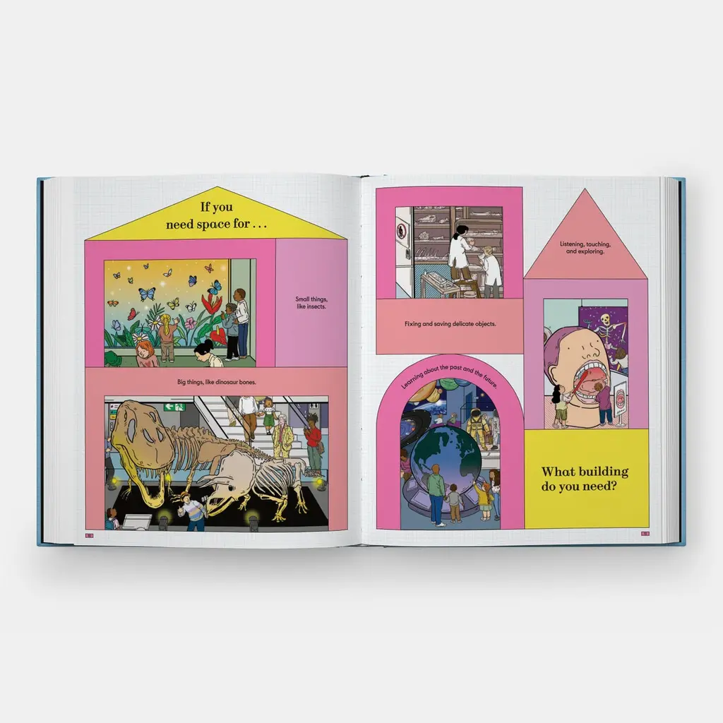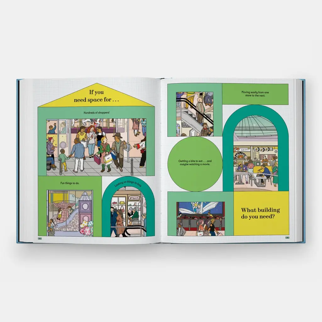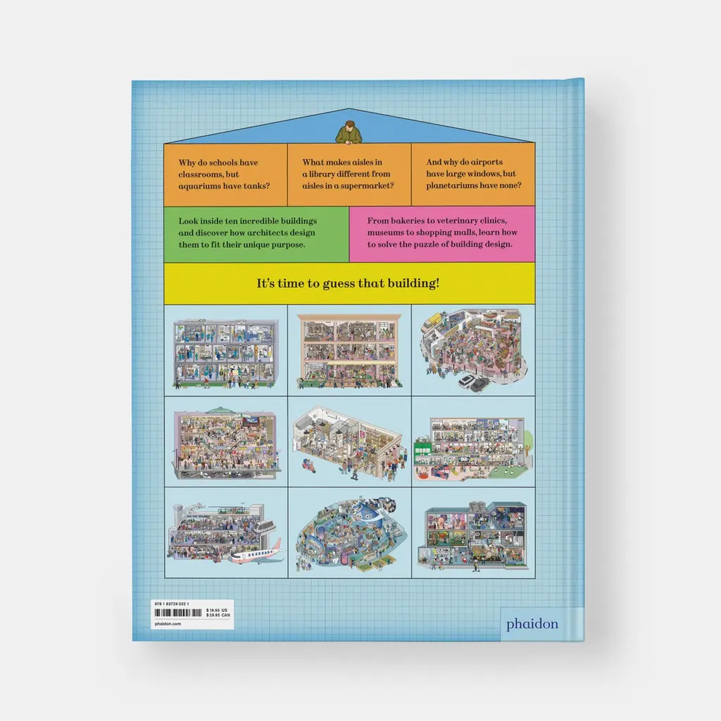 A playful introduction to design and architecture with cutaway scenes of ten buildings, featuring an interactive guessing game and search-and-findIn this interactive first book of architecture, children discover how architects design everyday buildings, from planetariums, aquariums, and airports to supermarkets and shopping malls, so that they best meet their users’ needs. Set up as a guessing game, the book presents clues that invite readers to guess which type of building is needed in 10 different scenarios. For example, what building do you need for students, teachers, and learning about science, history, and art? A school! Children continue the fun by looking for the hidden architect on each spread.Answers are provided in dramatic cutaway reveals that are jam-packed with details that children will delight in. Each building is accompanied by informative yet whimsical text that explains its architectural and design features.