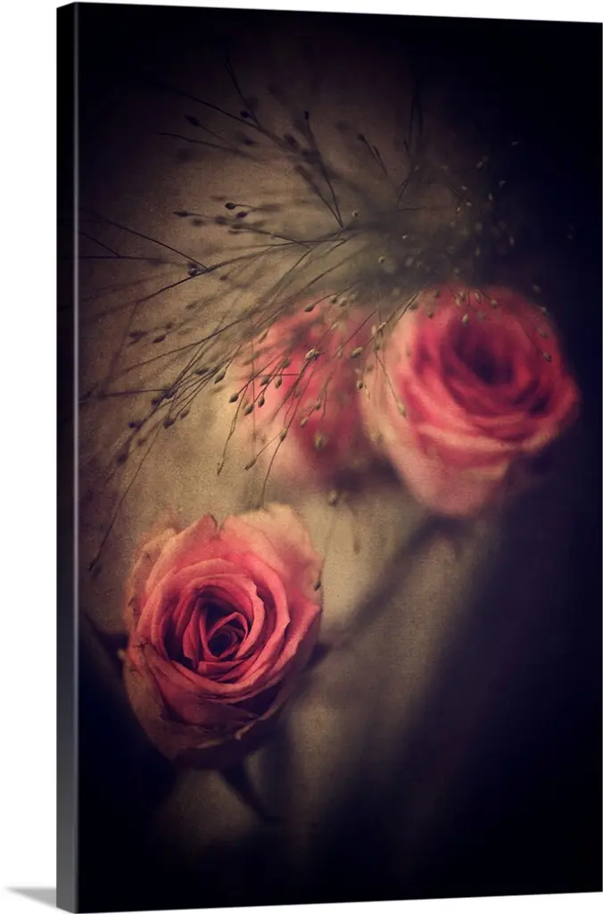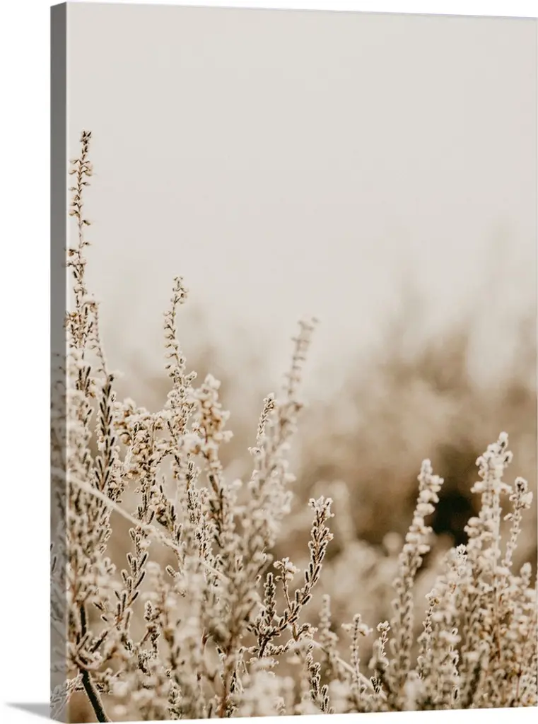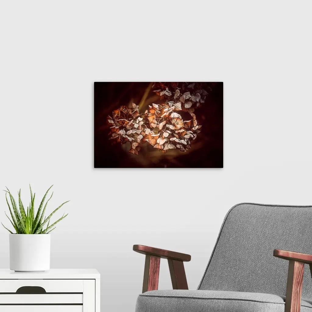 Clusters of dried hydrangea blossoms dusted with a light layer of snow create a warm, autumnal scene. The delicate interplay of light and shadow enhances the rich brown and earthy tones of the flowers.