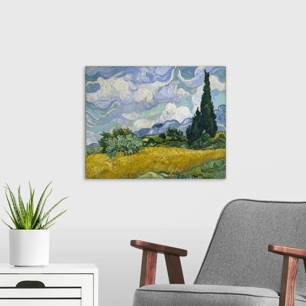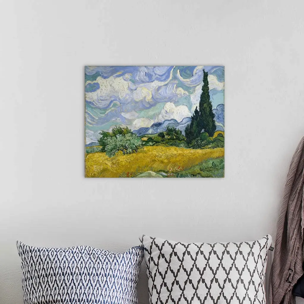 Cypresses gained ground in Van Gogh's work by late June 1889 when he resolved to devote one of his first series in Saint-Remy to the towering trees. Distinctive for their rich impasto, his exuberant on-the-spot studies include the Met's close-up vertical view of cypresses (49.30) and this majestic horizontal composition, which he illustrated in reed-pen drawings sent to his brother on July 2. Van Gogh regarded the present work as one of his best summer landscapes and was prompted that September to make two studio renditions: one on the same scale (National Gallery, London) and the other a smaller replica, intended as a gift for his mother and sister (private collection).