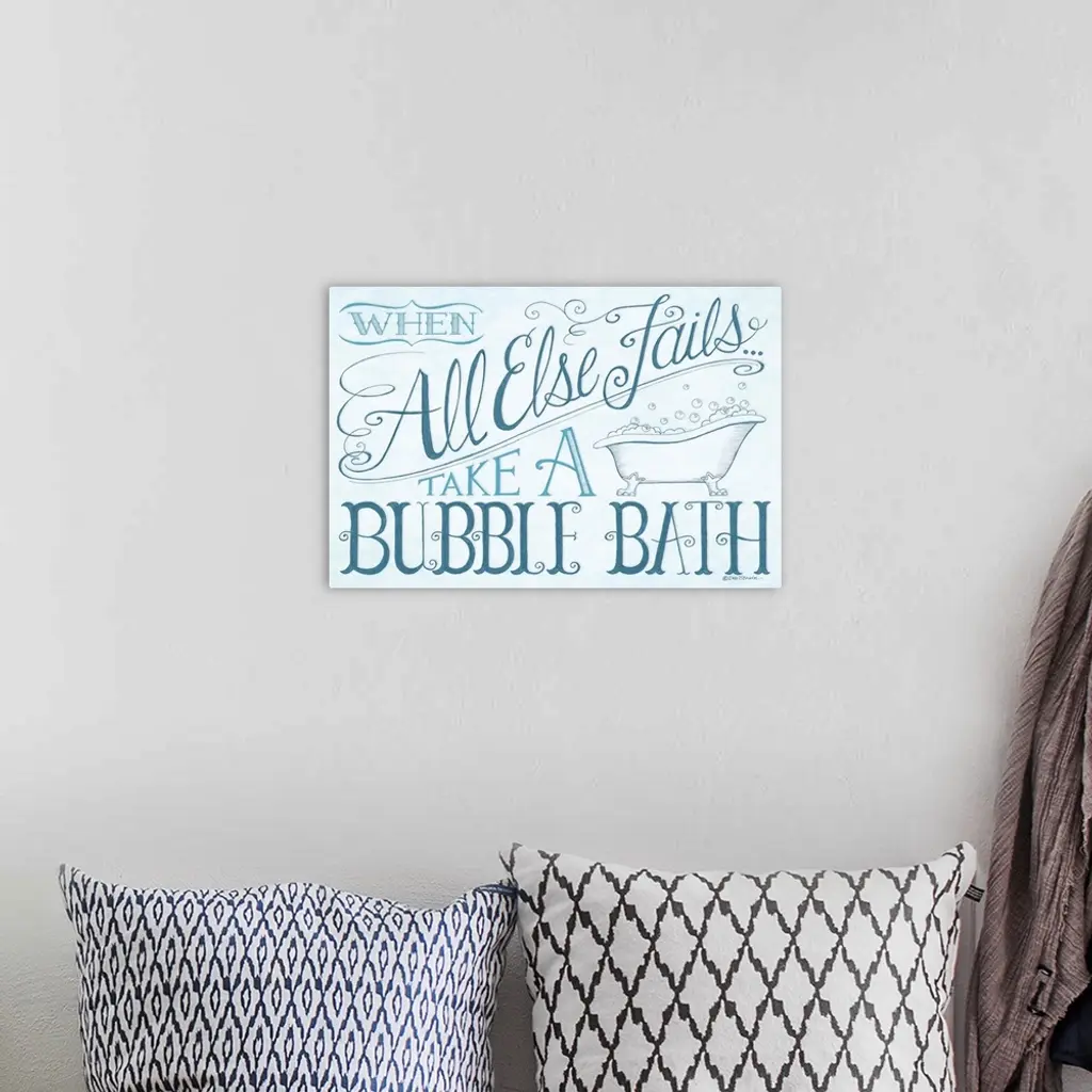 Handlettered home decor art for a bathroom, with dark blue lettering against a distressed light blue background.