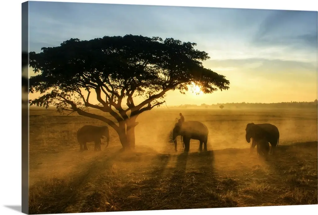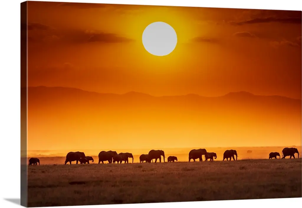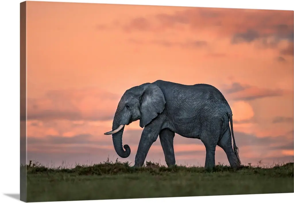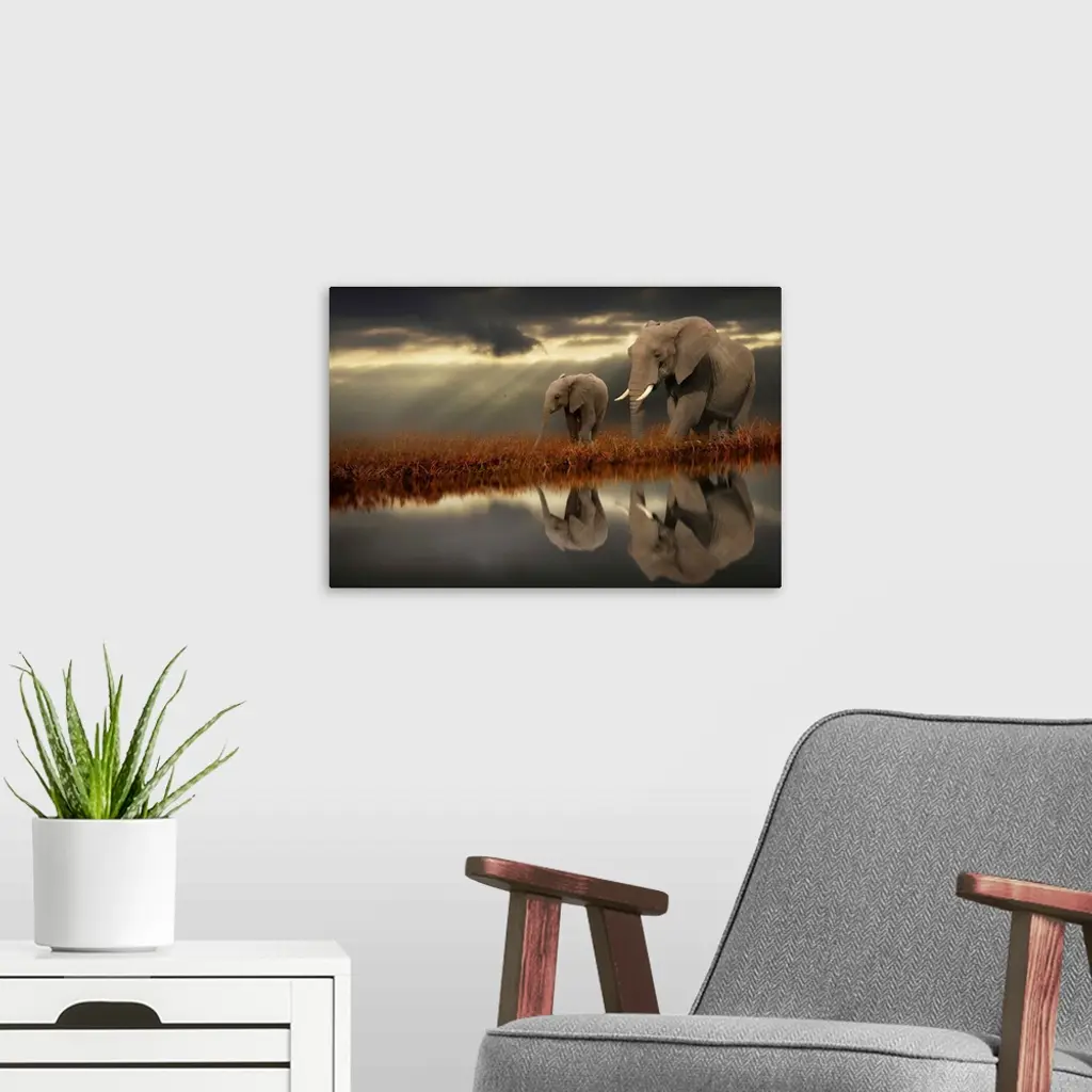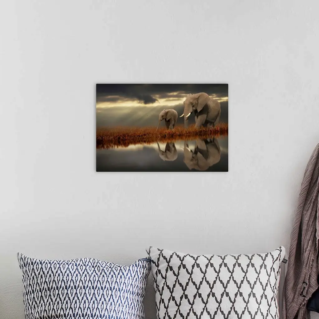 Two elephants walking along the water, with their reflections mirrored below, on a cloudy day.
