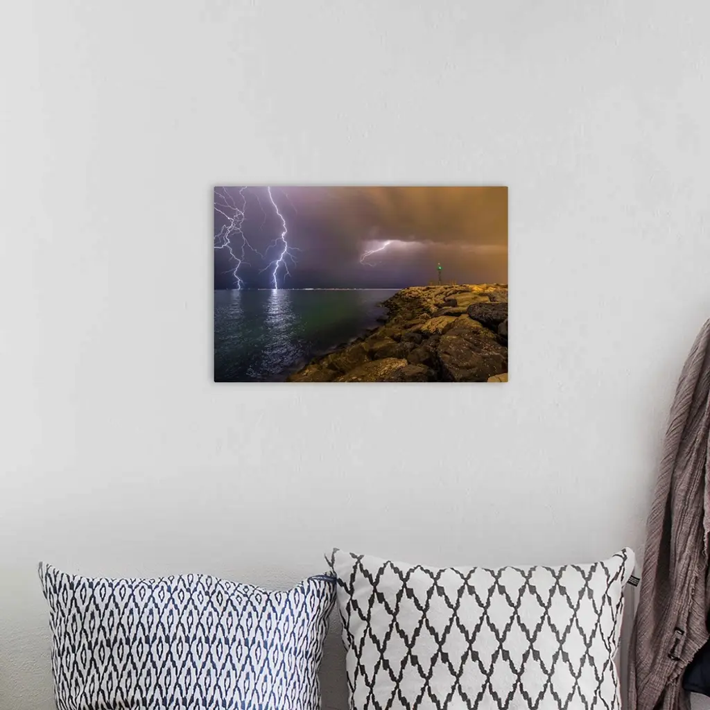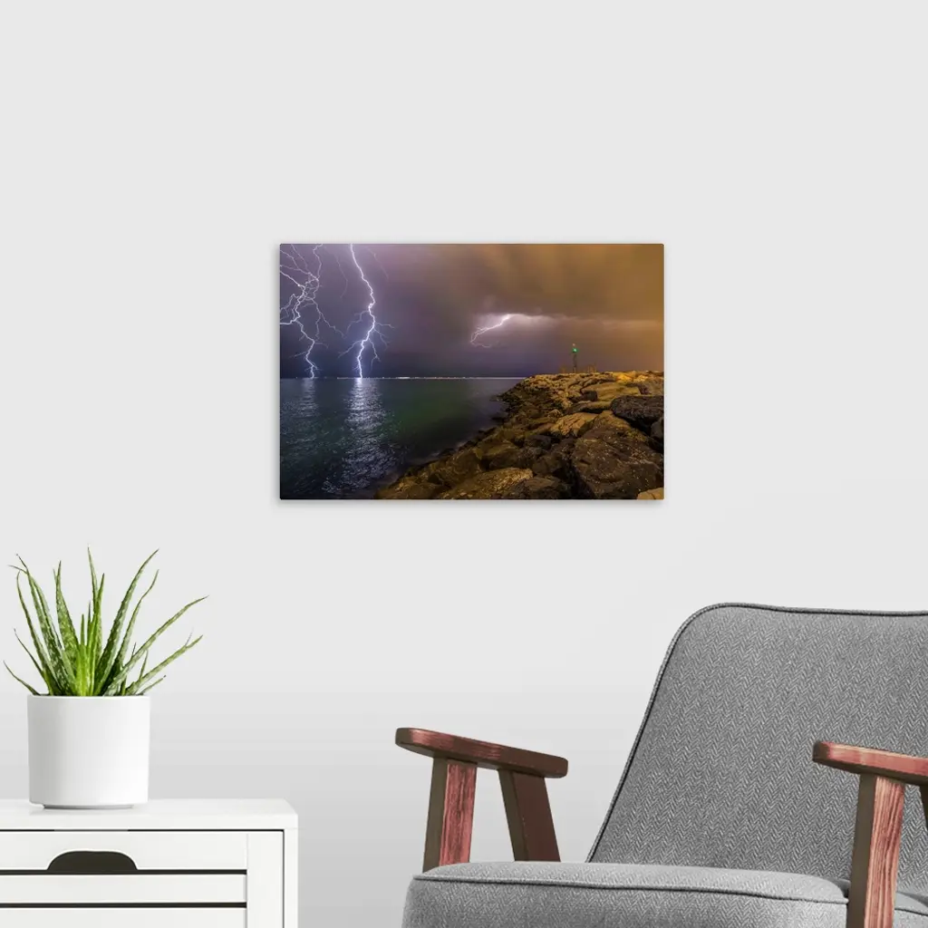 An intense photograph of a coastal scene with multiple lightning strikes hitting the ocean.