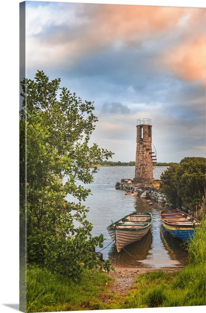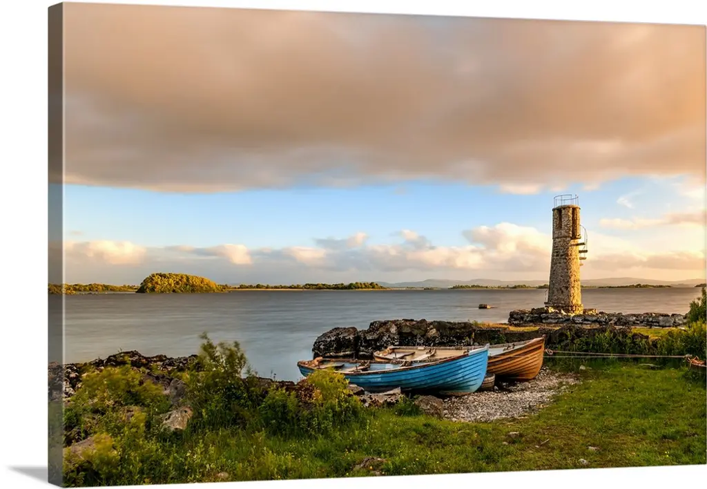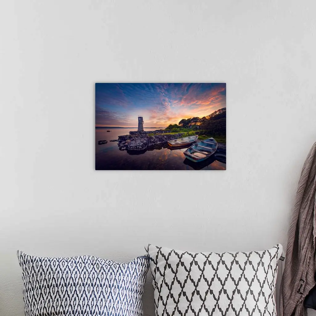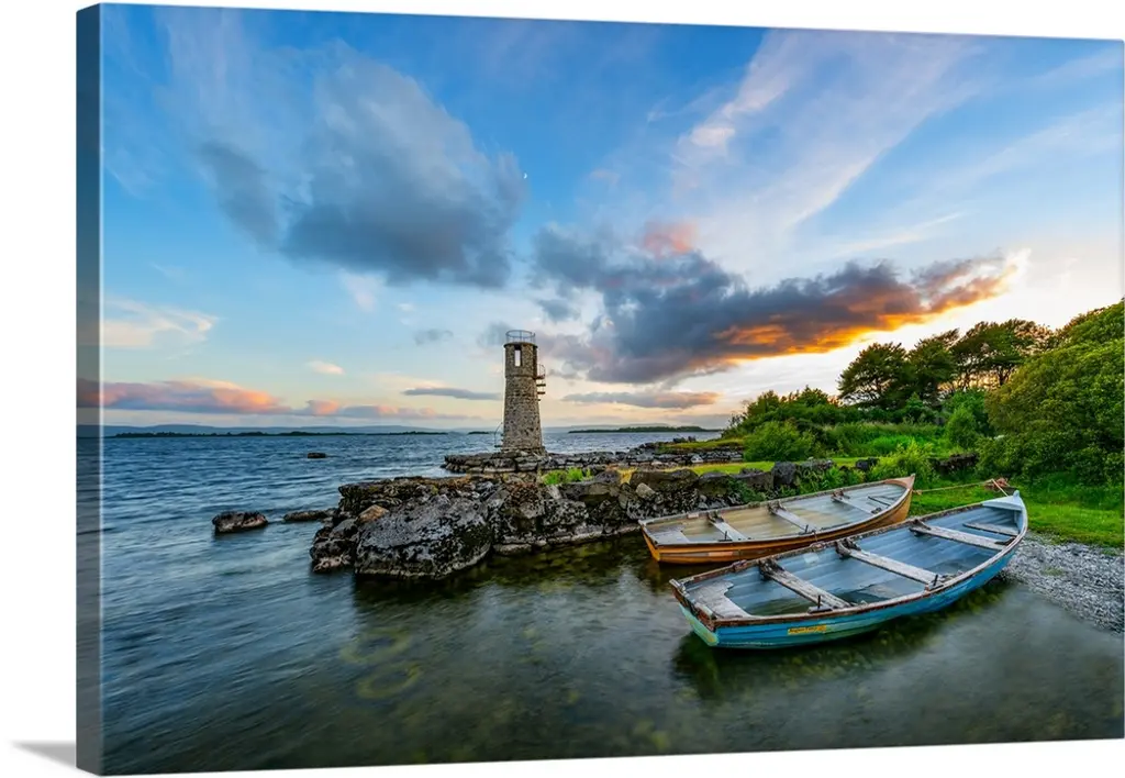 Sunset in Ireland with rowing boats in the foreground around a lighthouse