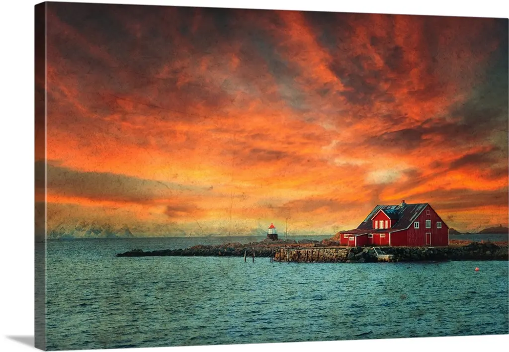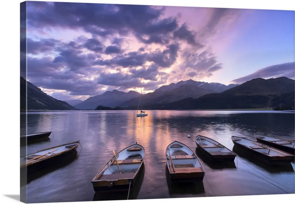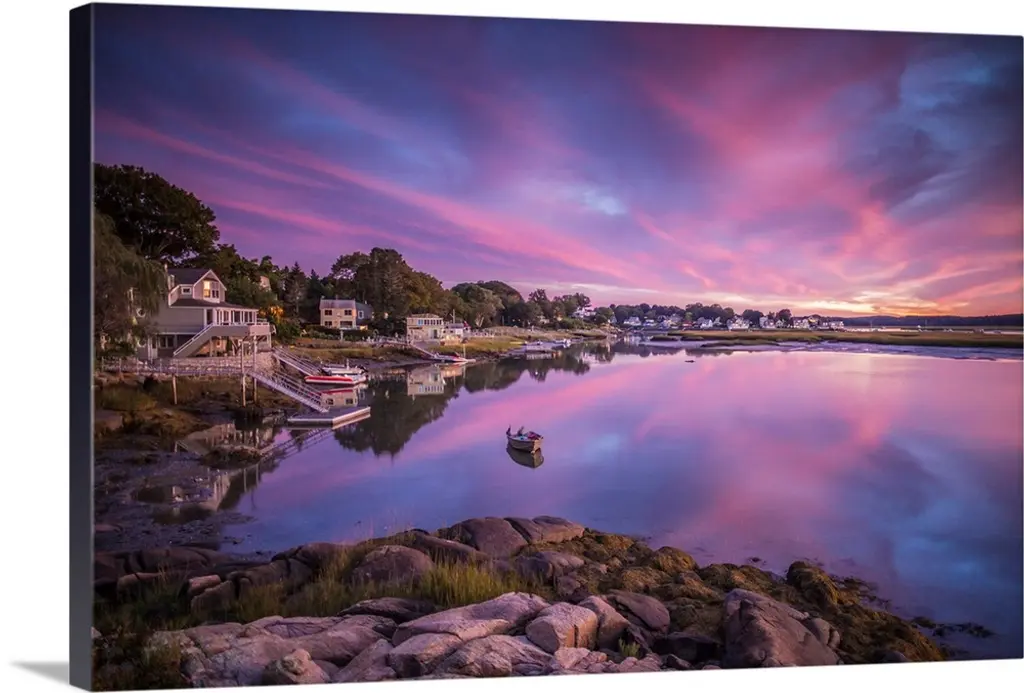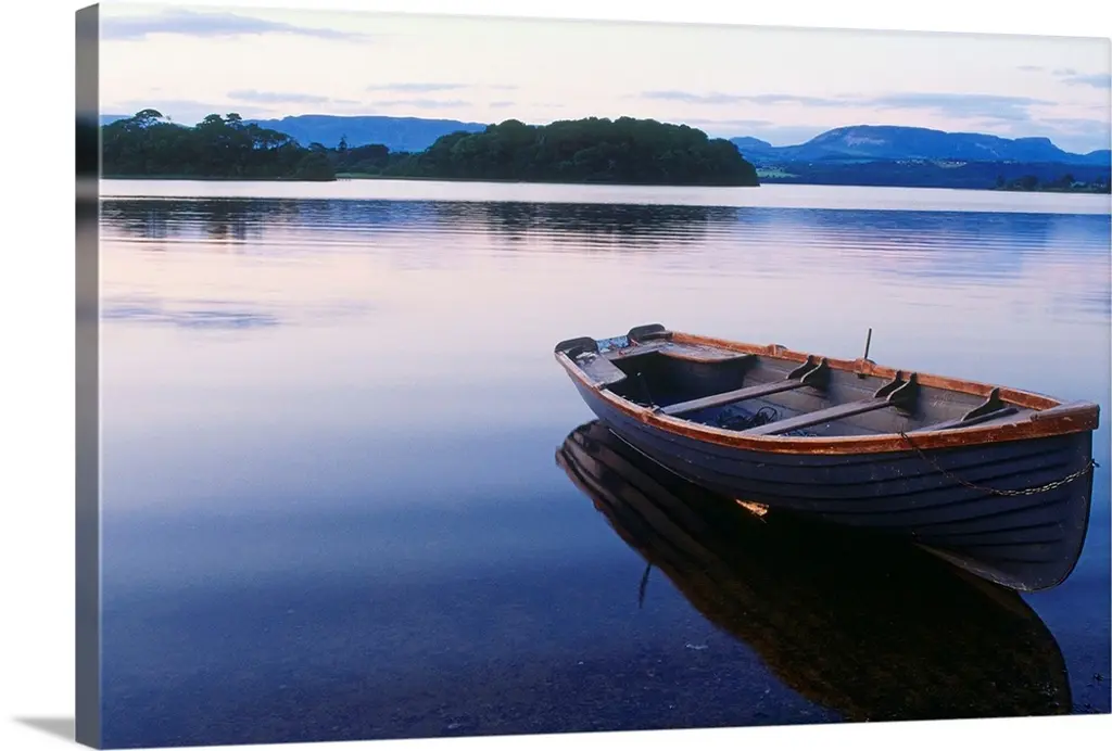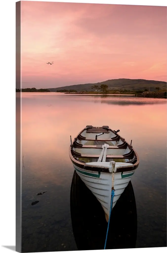 Sunset in Ireland with rowing boats in the foreground around a lighthouse