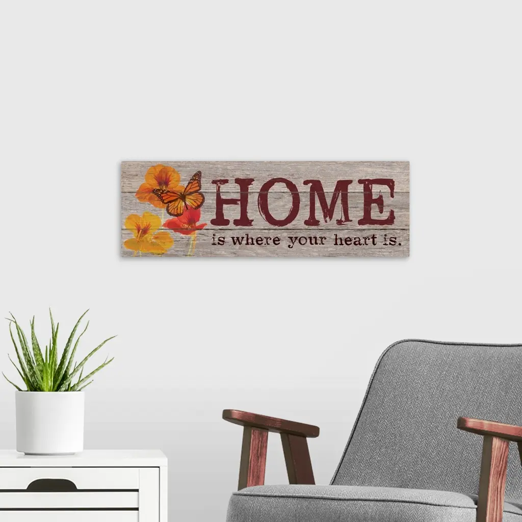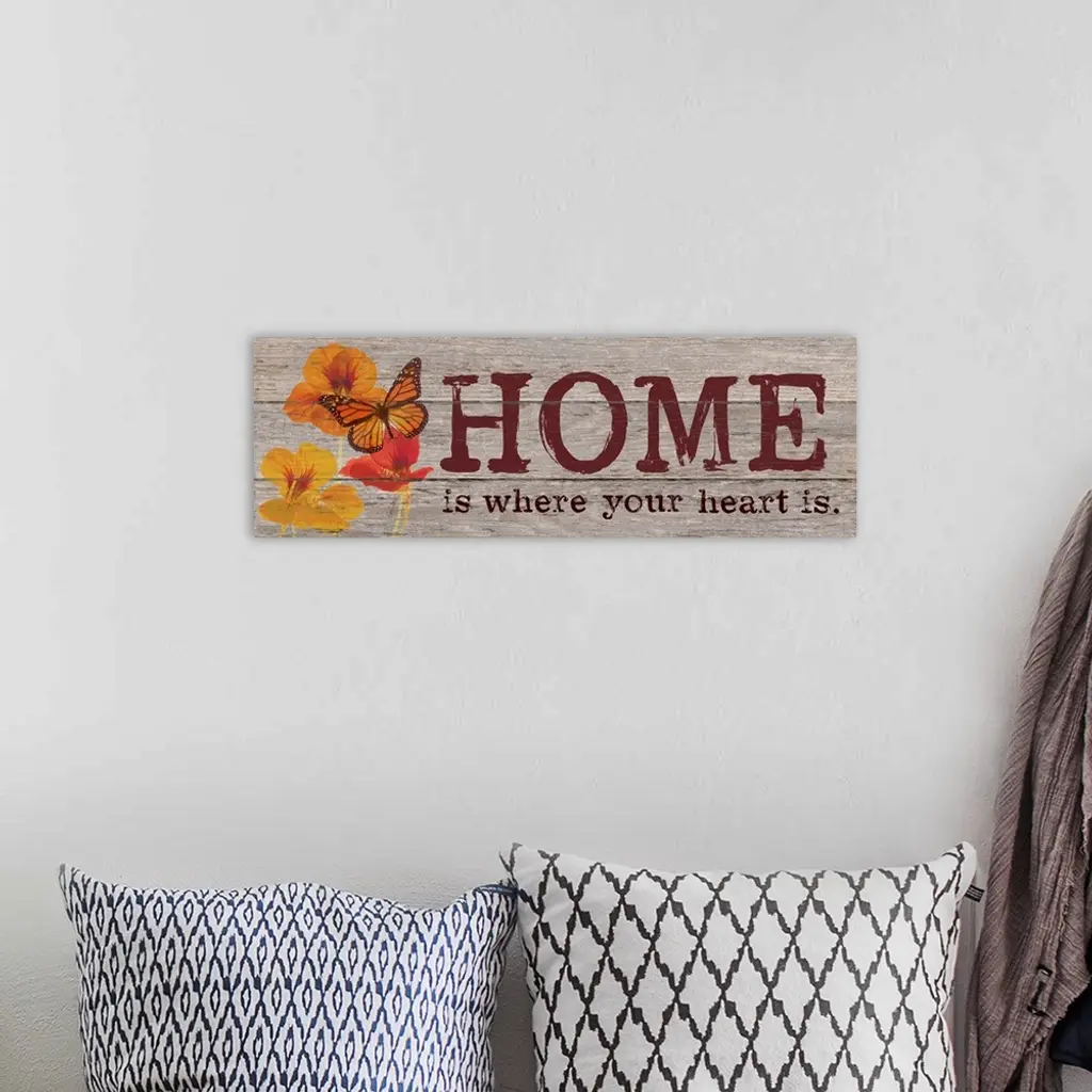 Contemporary family art using flowers and typography on a rustic looking wooden surface.