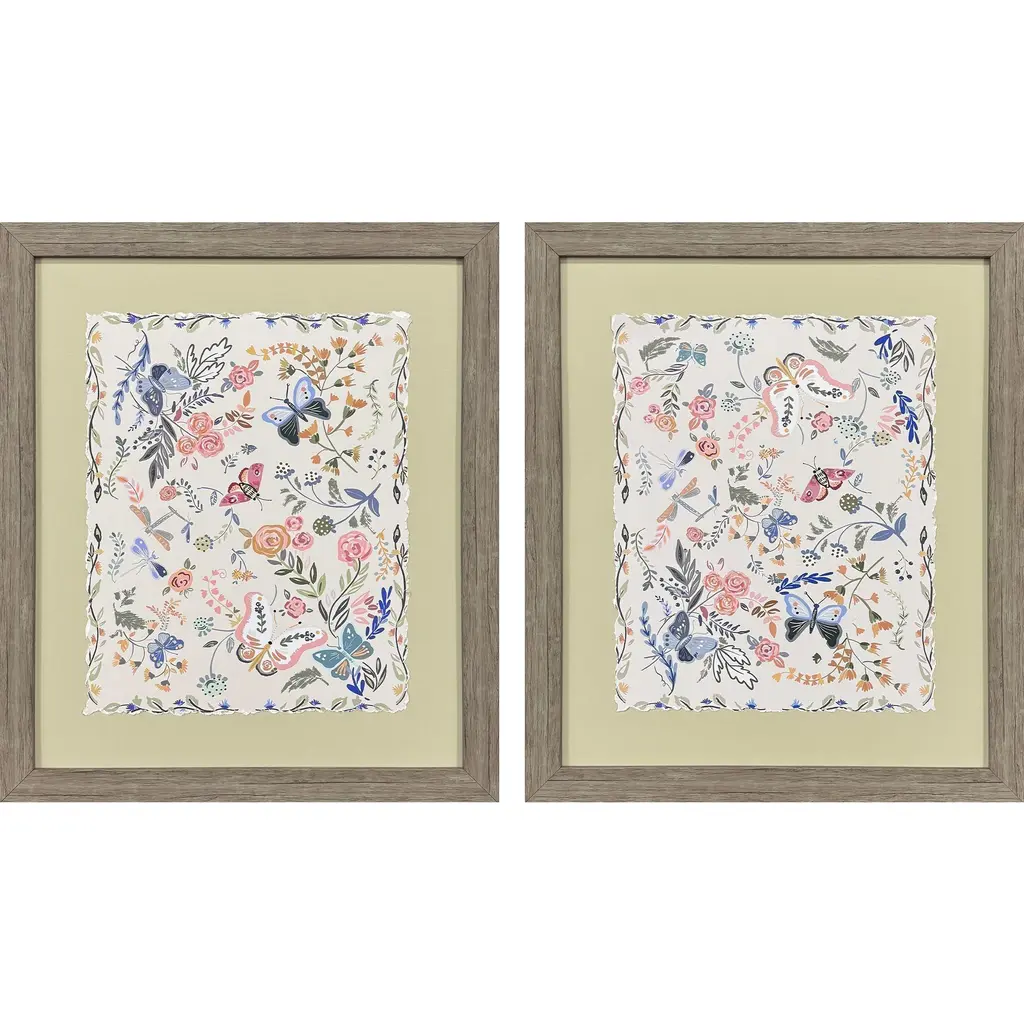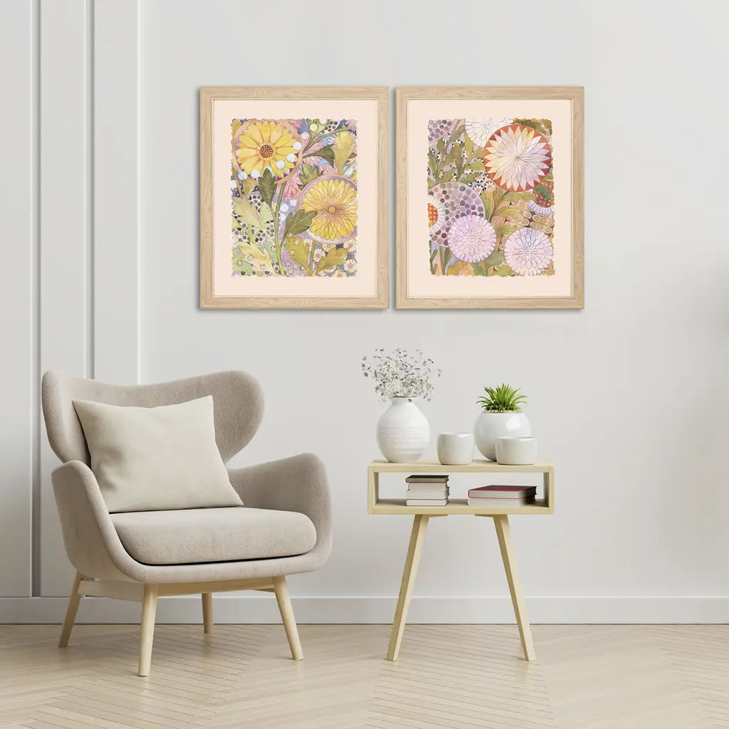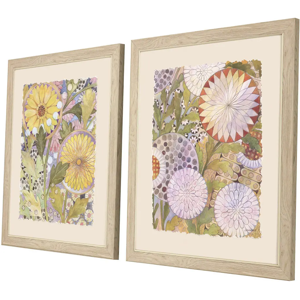 A set of two whimsical garden images that are deckled and mounted on a single mat. These pieces are framed under glass with a light wood tone frame.