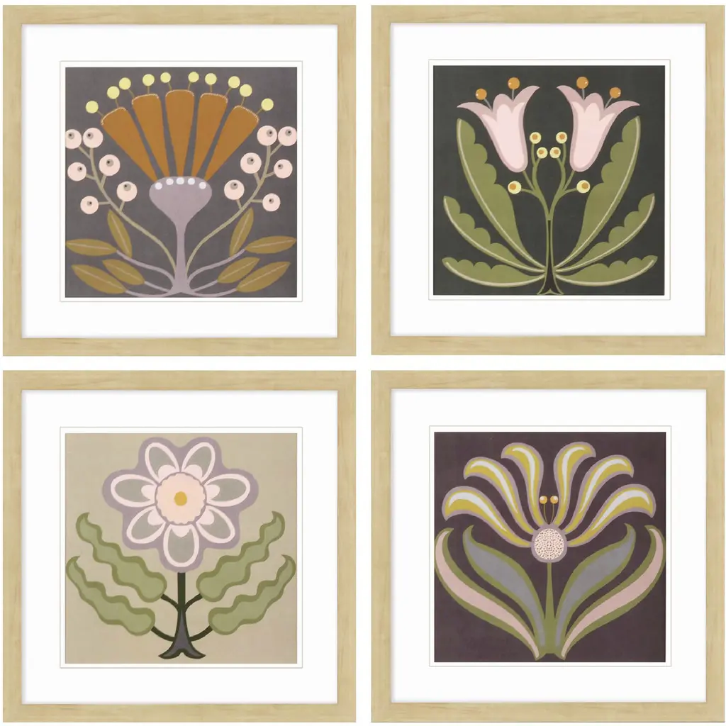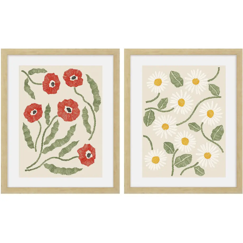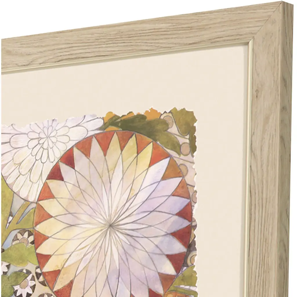A set of two whimsical garden images that are deckled and mounted on a single mat. These pieces are framed under glass with a light wood tone frame.