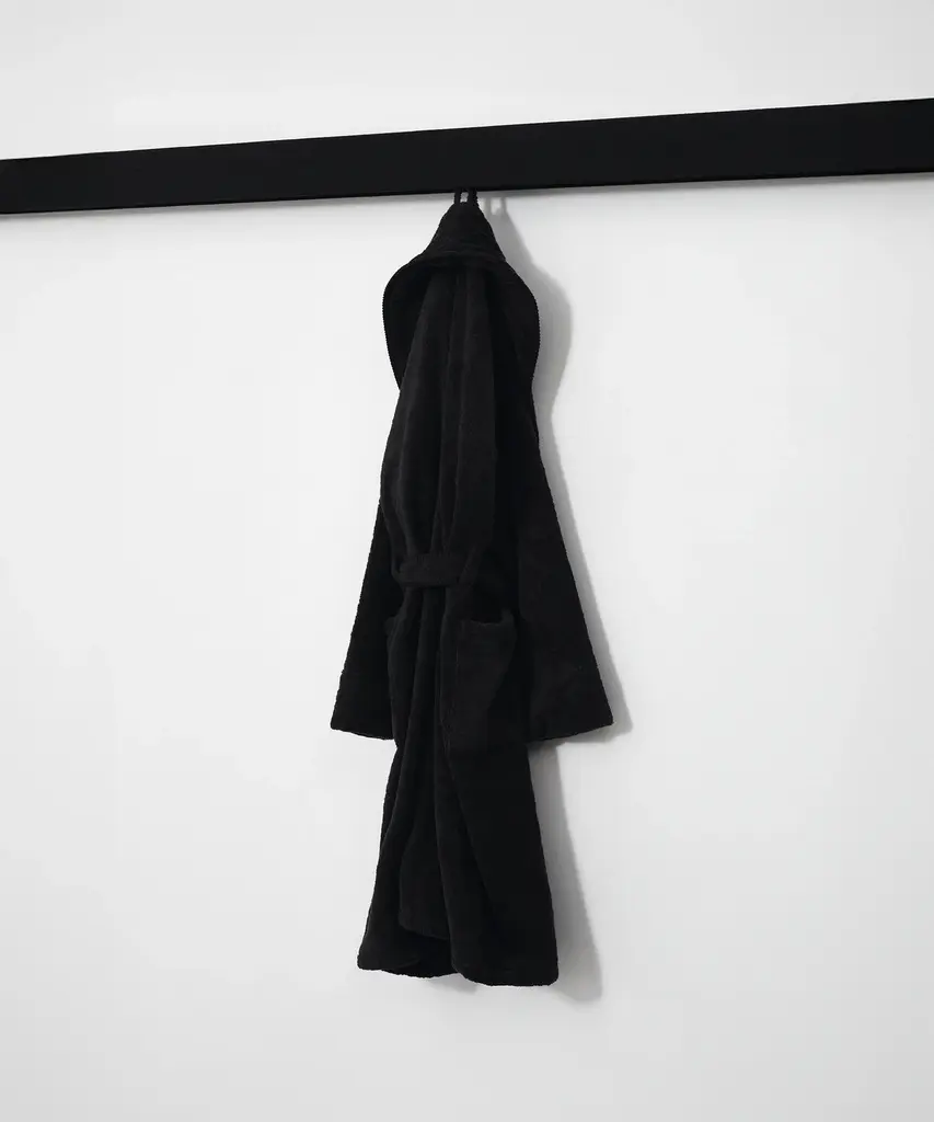 A shawl-collared bathrobe in terry cotton with whipstitch detailing on edges, chest pocket and belt. Designed for wrapping the whole body, it is oversized and generously long. Produced in Italy by Kvadrat/Raf Simons.