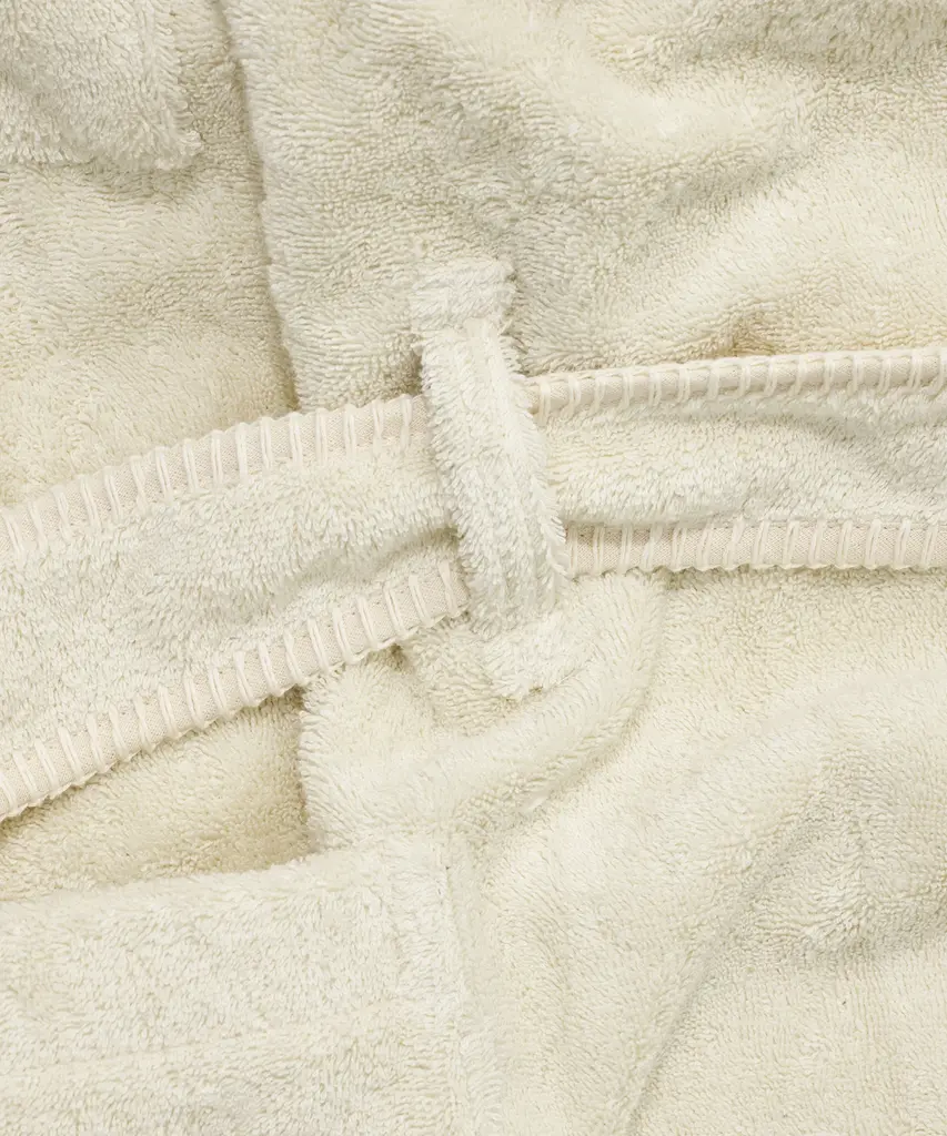 A shawl-collared bathrobe in terry cotton with whipstitch detailing on edges, chest pocket and belt. Designed for wrapping the whole body, it is oversized and generously long. Produced in Italy by Kvadrat/Raf Simons.