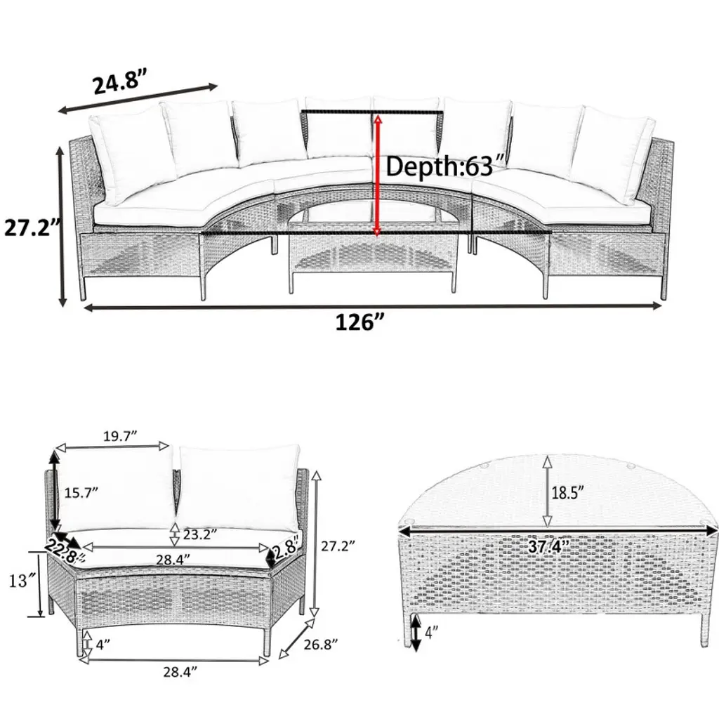 Create a relaxing outdoor oasis with this 5-piece PE rattan wicker sofa set, designed for both style and durability. Featuring four 2-person half-moon sofas and a tempered glass coffee table, this patio set offers ample seating and an elegant curved design perfect for any outdoor space. Built with a sturdy steel frame and wrapped in weather-resistant PE rattan, it provides reliable support with a 350 lbs capacity per seat. The thick 2.8-inch cushions and soft pillows offer enhanced comfort, and the removable covers are easy to clean. Designed for versatile use, the modular pieces can be arranged in various configurations to suit any occasion, whether it's a sunset gathering or a peaceful afternoon coffee. For longevity, it's recommended to cover the cushions when not in use and avoid prolonged exposure to harsh weather. This modern, practical sofa set brings a touch of sophistication to your patio, garden, or backyard.