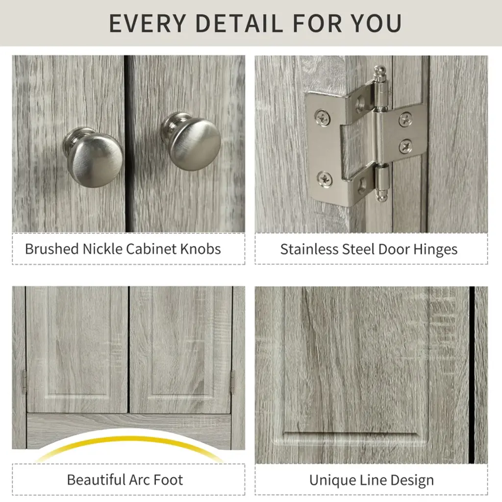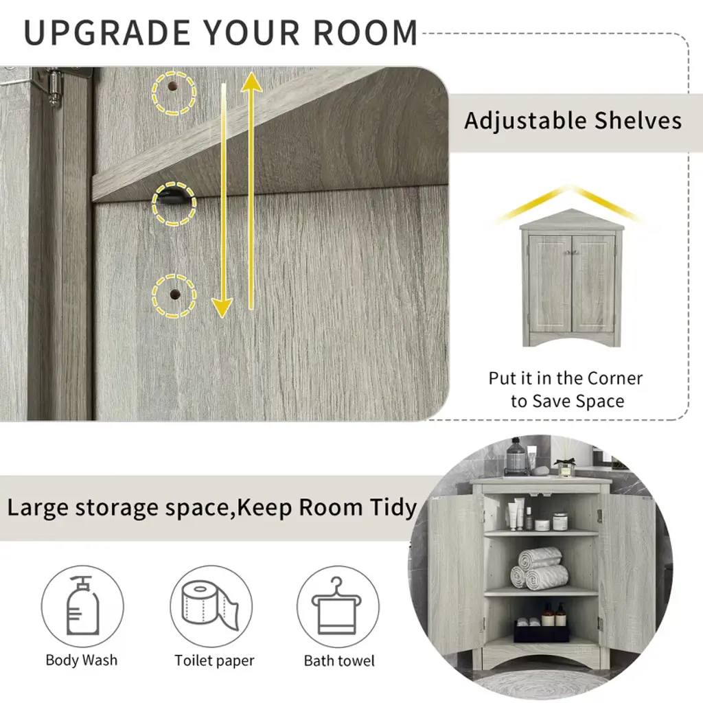 Introducing our Affordable Corner Storage Cabinet, designed to seamlessly blend visual appeal with functional practicality. Featuring adjustable shelves, this cabinet caters to your diverse storage needs, while convenient metal knobs make access effortless. Crafted from high-quality MDF board, it outperforms standard particleboard, ensuring durability and moisture resistance. Its waterproof surface allows for easy maintenance, keeping the cabinet looking like new over time. Perfect for any space, whether in the bathroom, laundry, pantry, or living room, this compact cabinet provides ample storage for towels, toiletries, spice jars, snacks, and more, all while maintaining a fresh and clean appearance by concealing items behind closed doors. Enhance your home organization with this versatile and stylish storage solution!