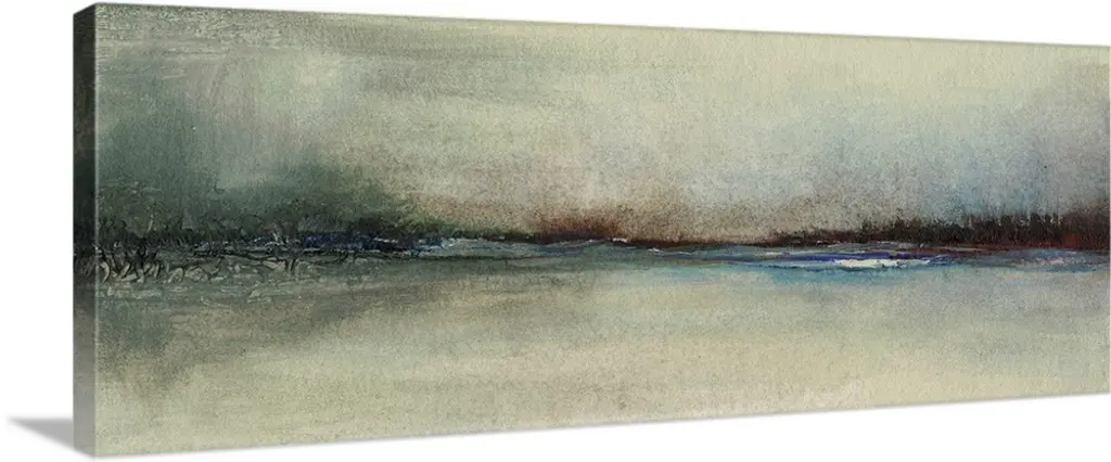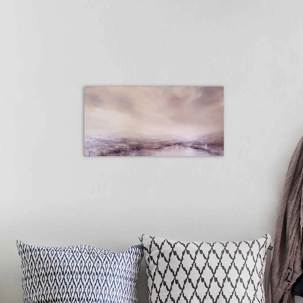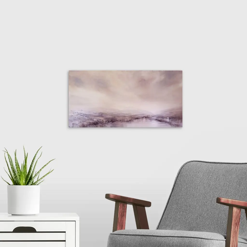 Abstract painted landscape with vivid structures. Wide horizon, clouds, bright light, a river with coastlines and rocks that are reflected in the water. Soft grey and bright rose.