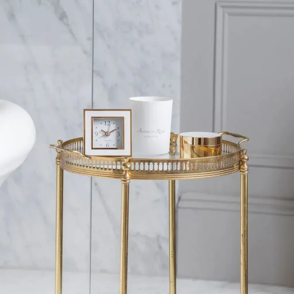 Our White Enamel Alarm Clock is finished in gold with a luxury dove grey velvet back. This gorgeous desk or bedside square clock has an alarm and requires a AA battery. The movement is encased within a removable gold cover. The clock comes with 1 screw in leg.