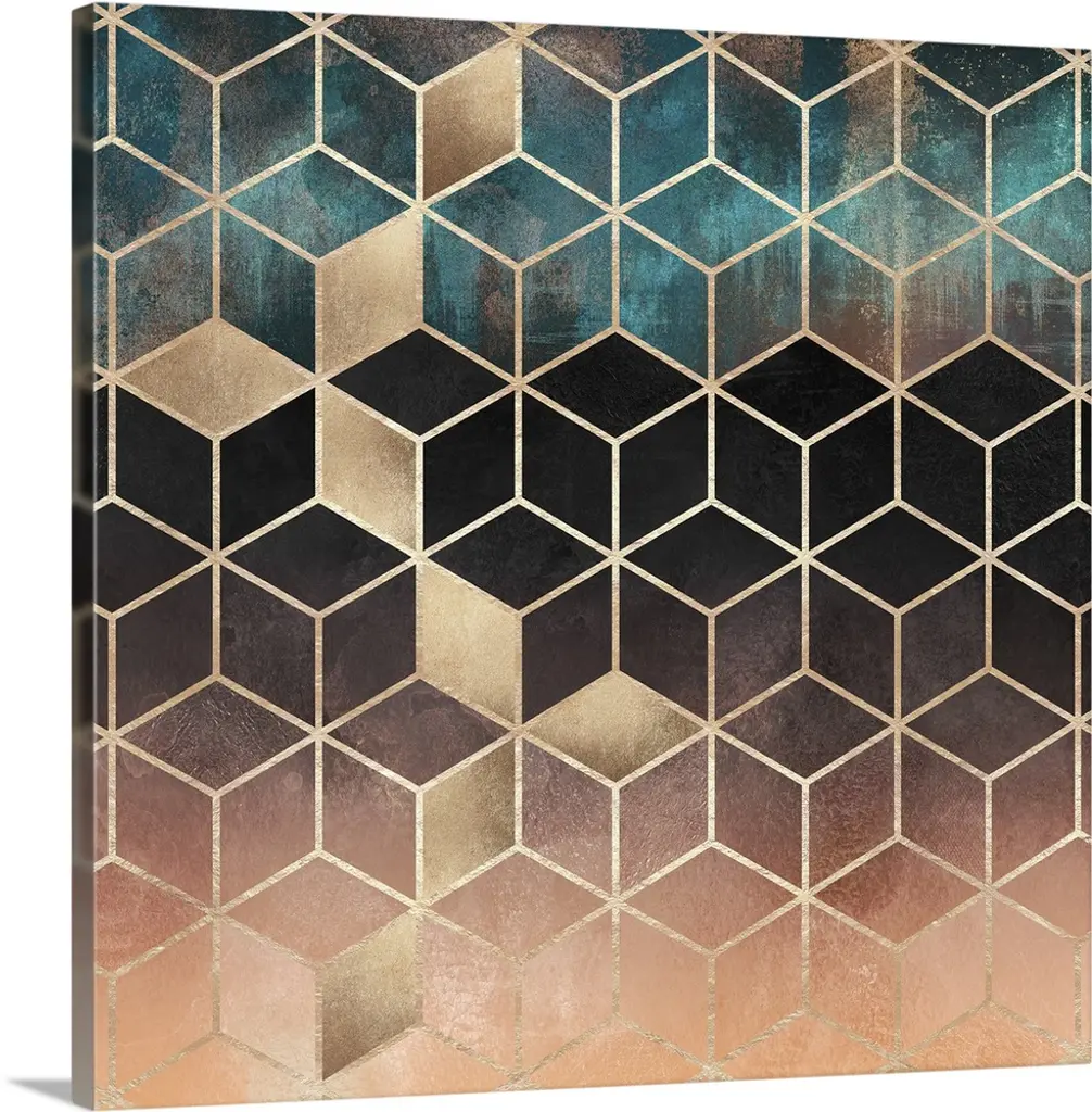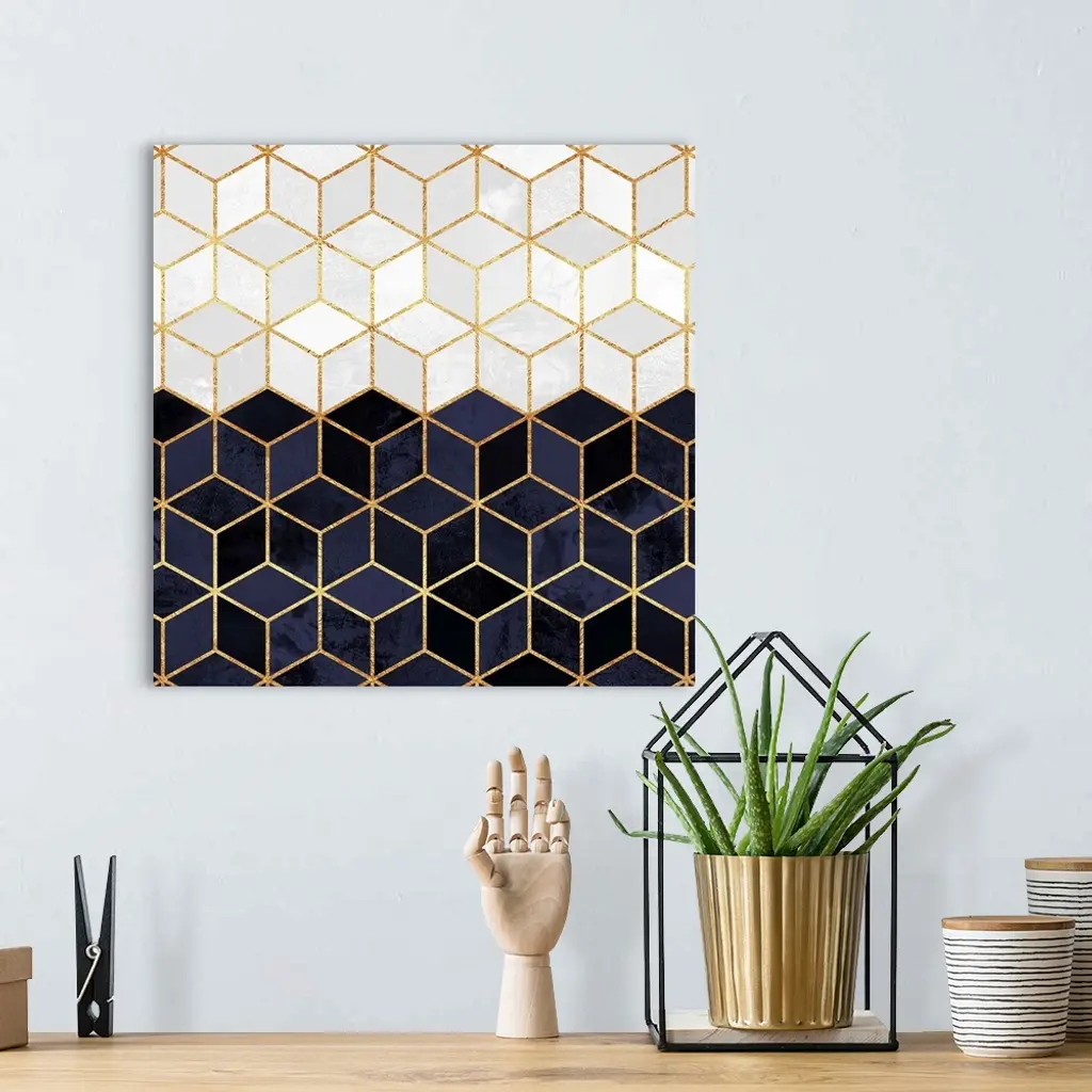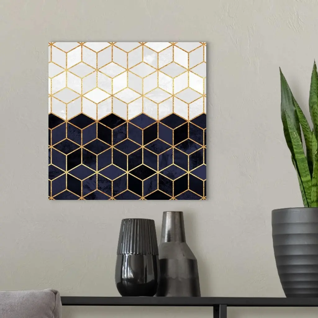 A prism of triangles in various shades of textured cream and navy are arranged in to form a three-dimensional prism effect. The triangles are outlined in gold.