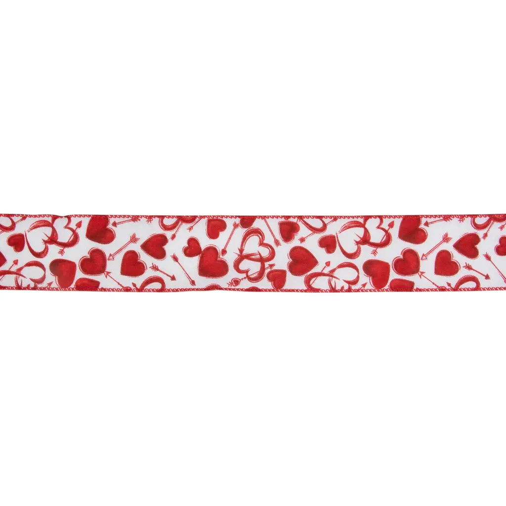 This gorgeous ribbon would be a great way to decorate your gifts and home for the holiday season. This wired ribbon will help everyday designs maintain their shape and beauty. Whether you're a florist an event planner or crafter wired edge ribbon is a dream to work with. Add this ribbon to gifts wreaths or trees to add sparkle and beauty to your home for the holiday. Product Features: White and red hearts Valentine's day crafting ribbon White fabric with red hearts with arrows Red glitter accents some of the hearts Sewn wire edged ribbon allows you to bend and shape your creations to decorate with ease Ribbon comes on (1) spool Recommended for indoor use only Dimensions: 2.5" wide x 10 yards in length Material(s): polyester/wire