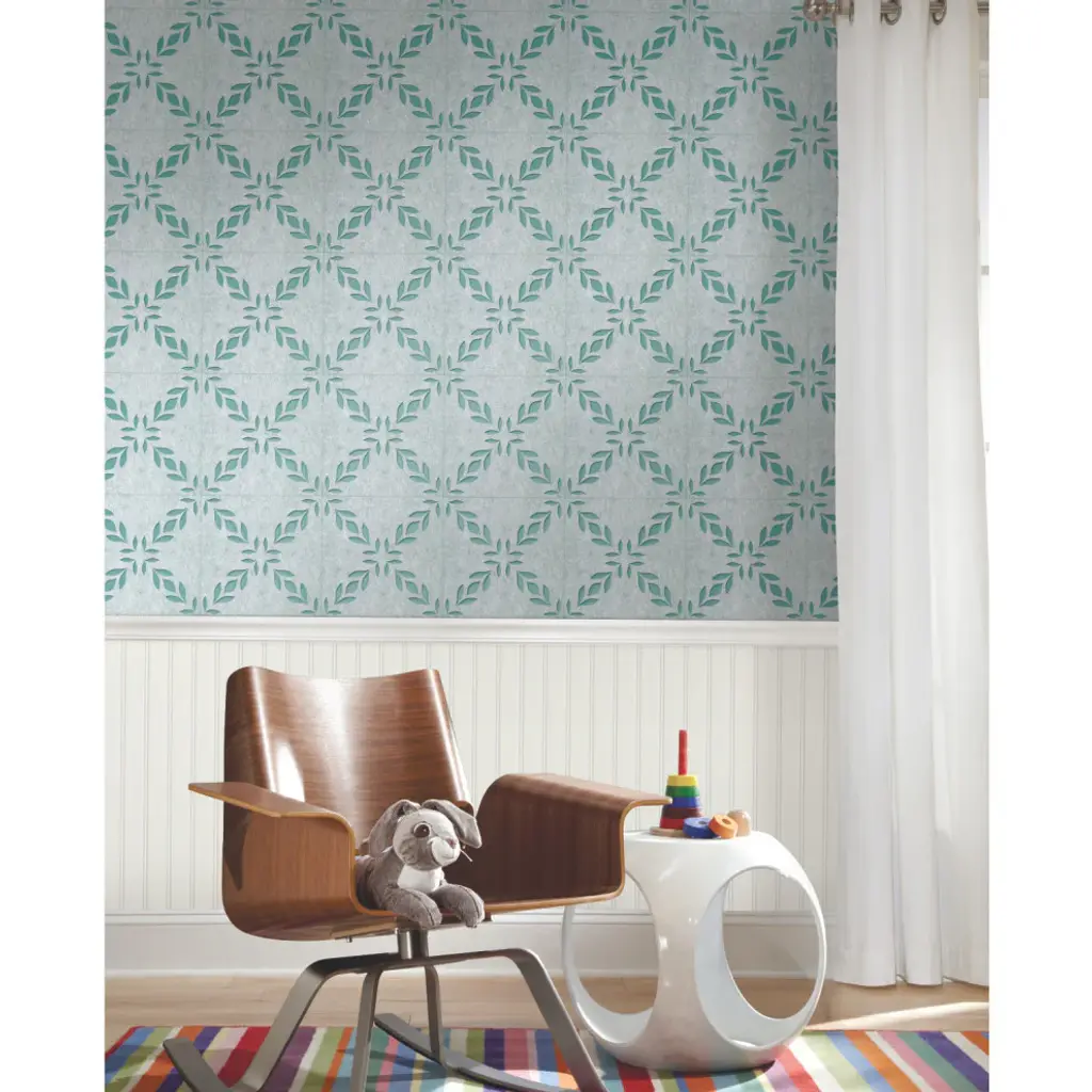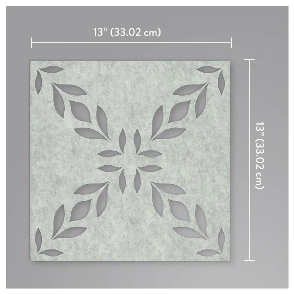 Comes with 4 pieces - 13 inches x 13 inches decals. Size(s) - 13 inches x 13 inches. Design has a random match with a no repeat. Covers 4.33 square feet. Nature inspires the leafy silhouette pattern of Botanical Trellis acoustical tiles, combining Boho style and the quietude of noise reduction with easy peel + stick adhesive technologies. Created from recycled water and soda bottles, QuietWall Peel + Stick has a pre-applied adhesive backing which is repositionable and removable, leaving no residue or damage to walls. It has a Class A fire rating, is antimicrobial, durable, scrubbable and can be bleach cleaned.Easy to hang, and completely removable, York QuietWall Peel + Stick combines the noise reducing properties of acoustical wallcoverings with the removable and repositionable innovations of peel + stick adhesive backing.