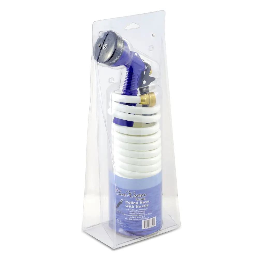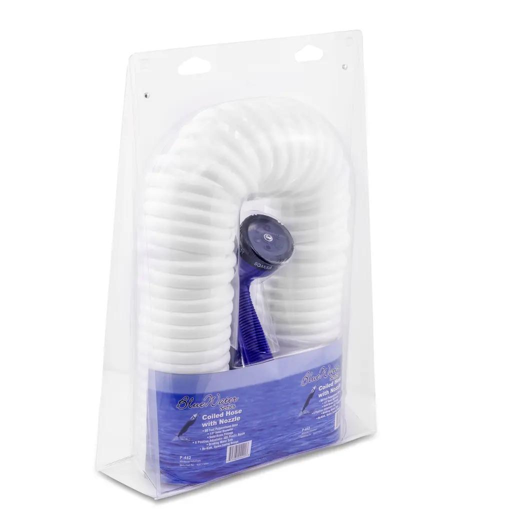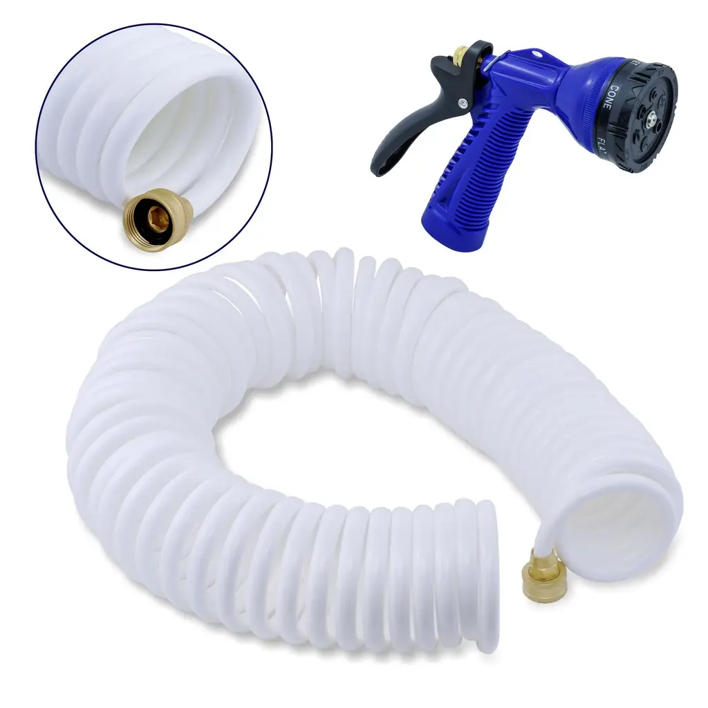 White Coiled Hose with Adjustable Nozzle Features: Material: Polyurethane Hose Perfect for gardening, watering plants and flowers, washing your car and more.