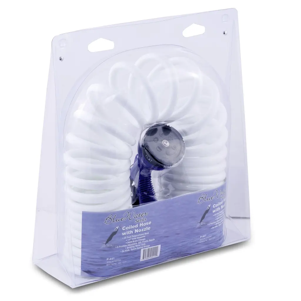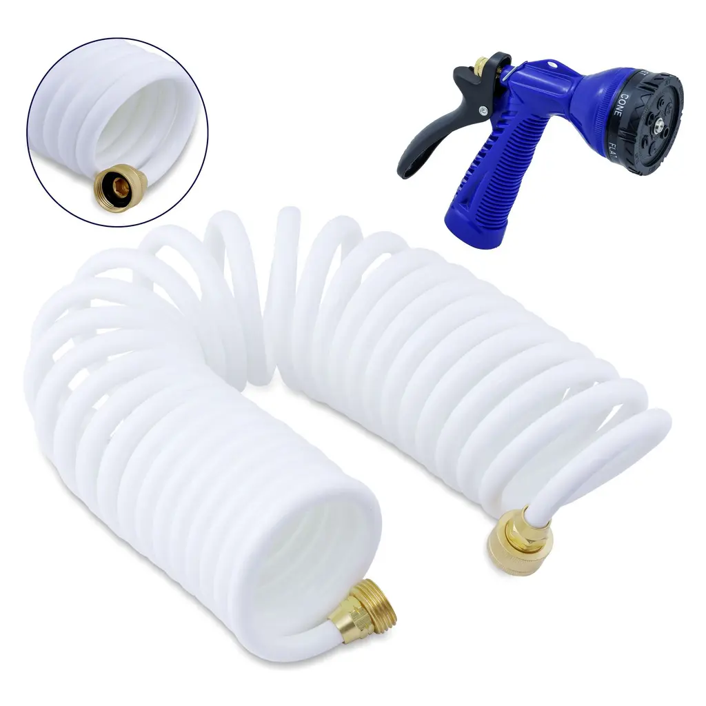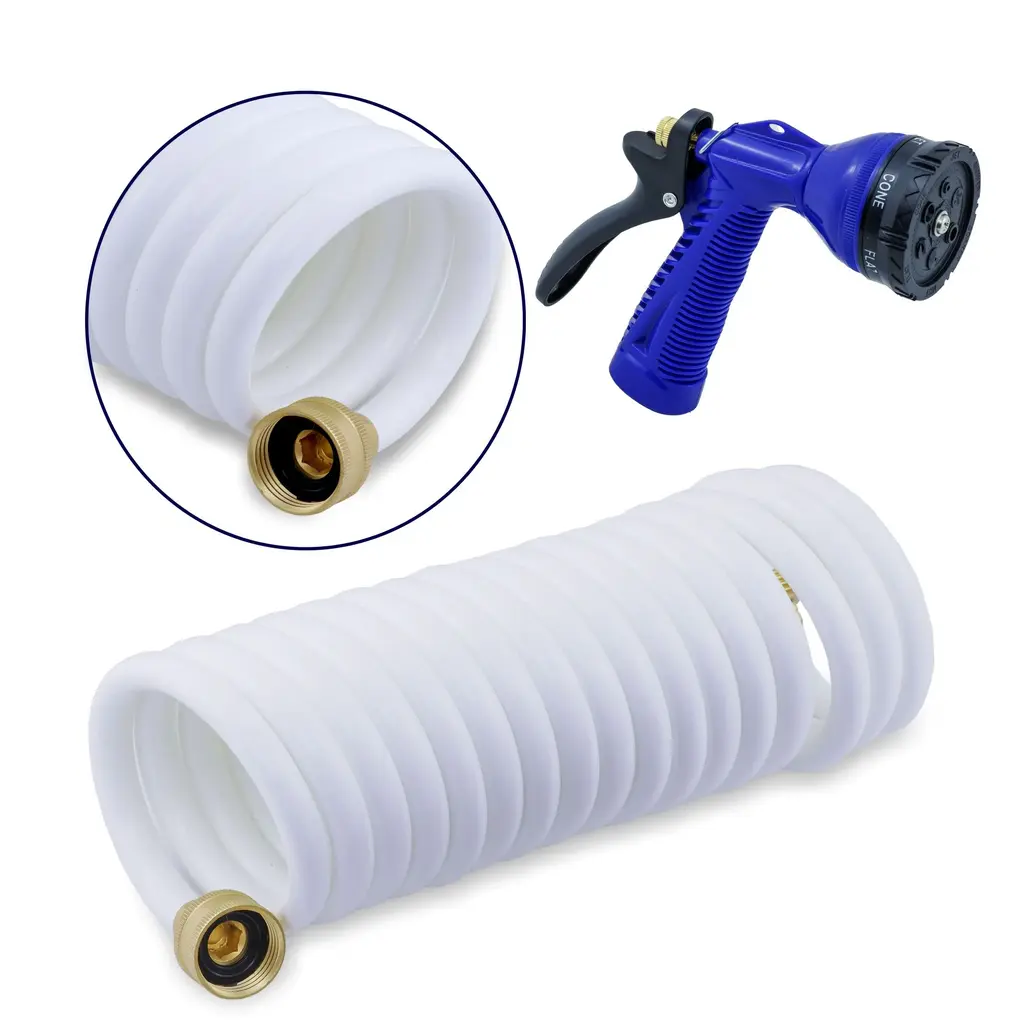 White Coiled Hose with Adjustable Nozzle Features: Material: Polyurethane Hose Perfect for gardening, watering plants and flowers, washing your car and more.