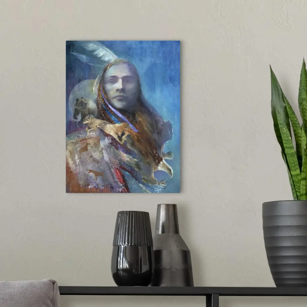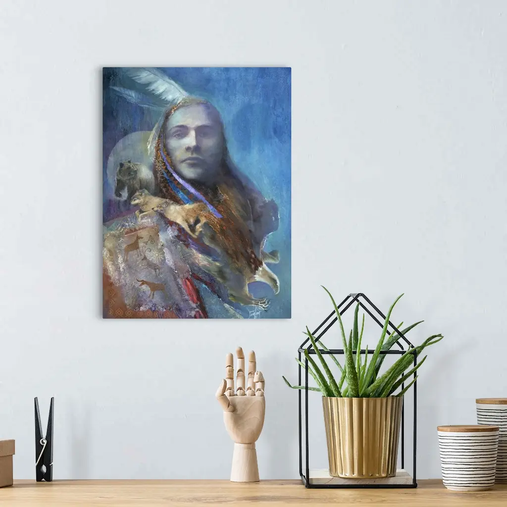 Native American man wearing a white feather in his hair. Around his shoulders and chest is a bear, wolves and an eagle.