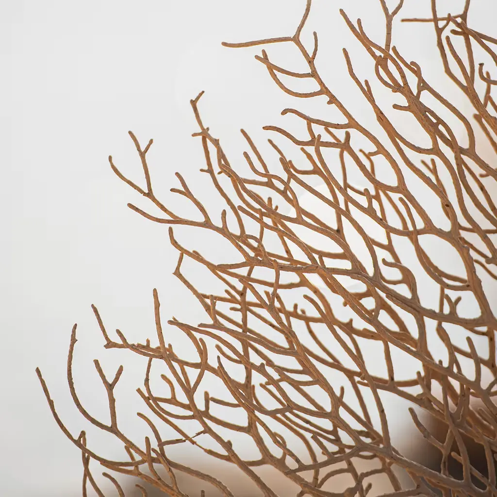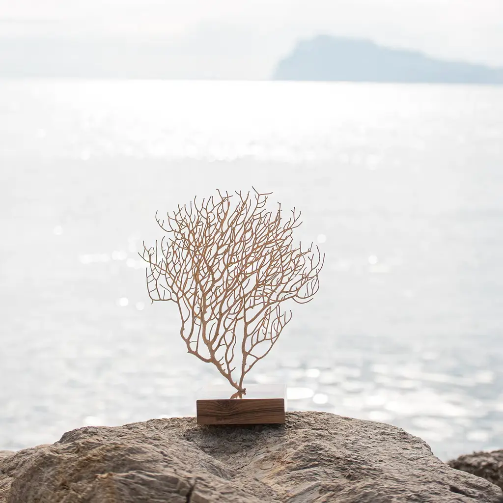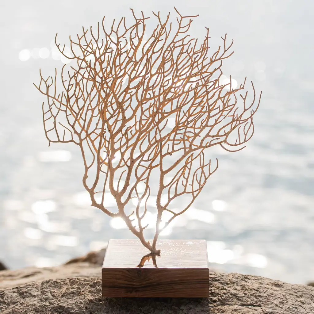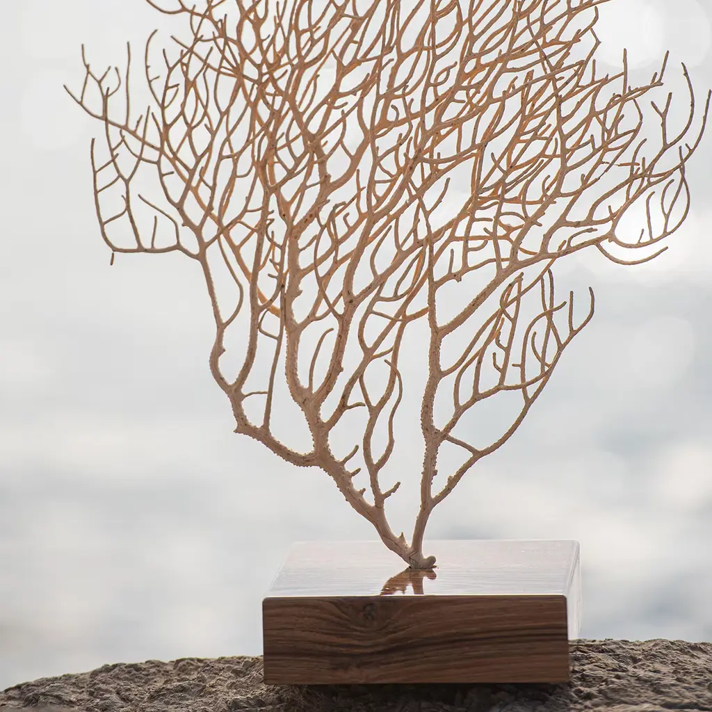 No decorative piece will evoke poetic seaside atmospheres as this singular example of white Gorgonia coral. CITES certified for safe import, the natural coral flaunts its intricately branched silhouette stemming from a precious plinth base in polished walnut. This piece will be a focal point of a modern and nautical-inspired home or boat decor.