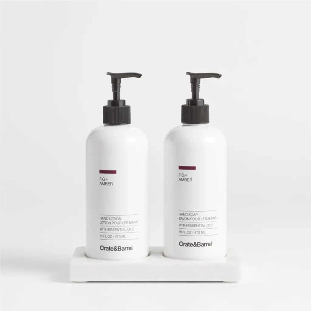Corral bottles of soap, countertop spray or lotion in this white marble caddy. The minimalist holder keeps two of our exclusive 16-oz. kitchen scents bottles right where you need themand brings a luxe look to your countertop. Cut, finished and polished by hand, each natural marble caddy is beautifully unique.
