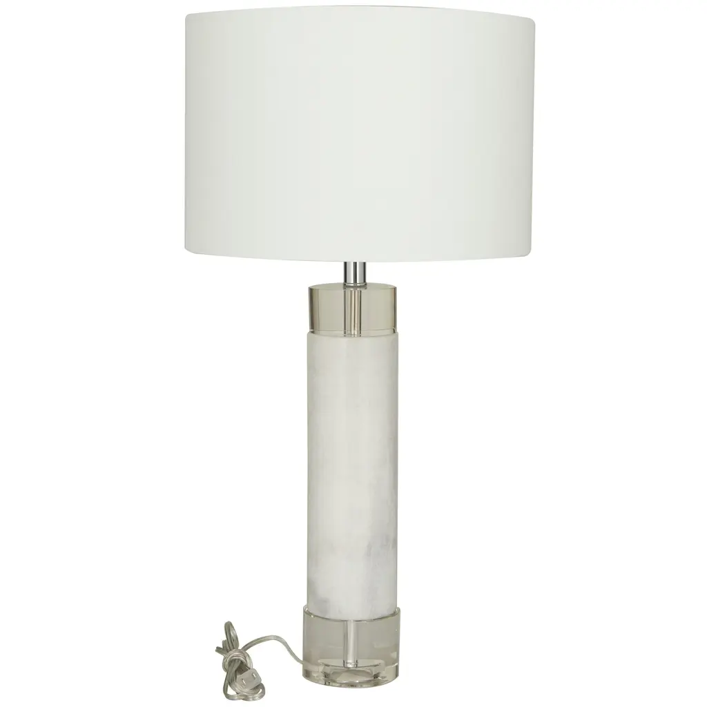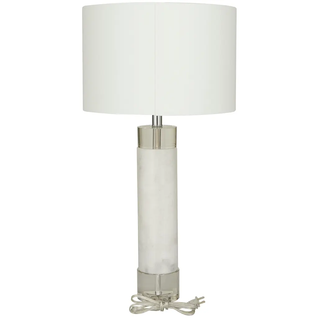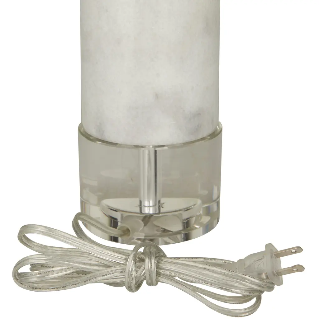 This white accent lamp is perfect to add elegance and brightness to your living room or bedroom corners. Requires 1 60W Type A E26/Medium (Standard) bulb. This item ships in 1 carton. Comes with a 72" cord length. Suitable for indoor use only. This item ships fully assembled in one piece. Table lamp comes with a white drum shaped shade that measures 15 x 15 x 10 inches. Includes a rotary switch. Marble is a product of nature and no two pieces are exactly alike. It is prone to variations in color and/or patterns in the material that add to the beauty and charm of the piece.. This is a single white colored accent lamp. Modern style.