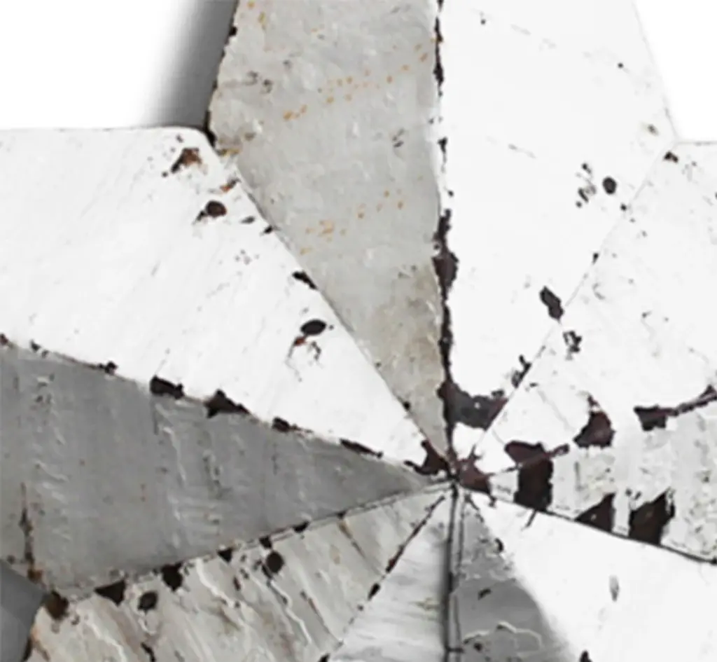 White barn star made from recycled galvanized metal roofing with a rustic aged painted patina. Industrial Americana farmhouse style great for many spaces. Each will have varying distress and hand crafted differences.