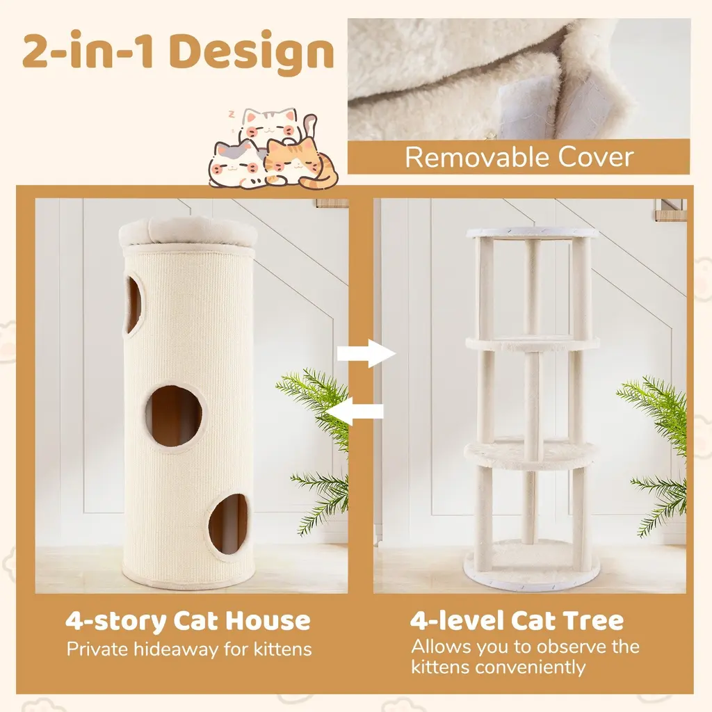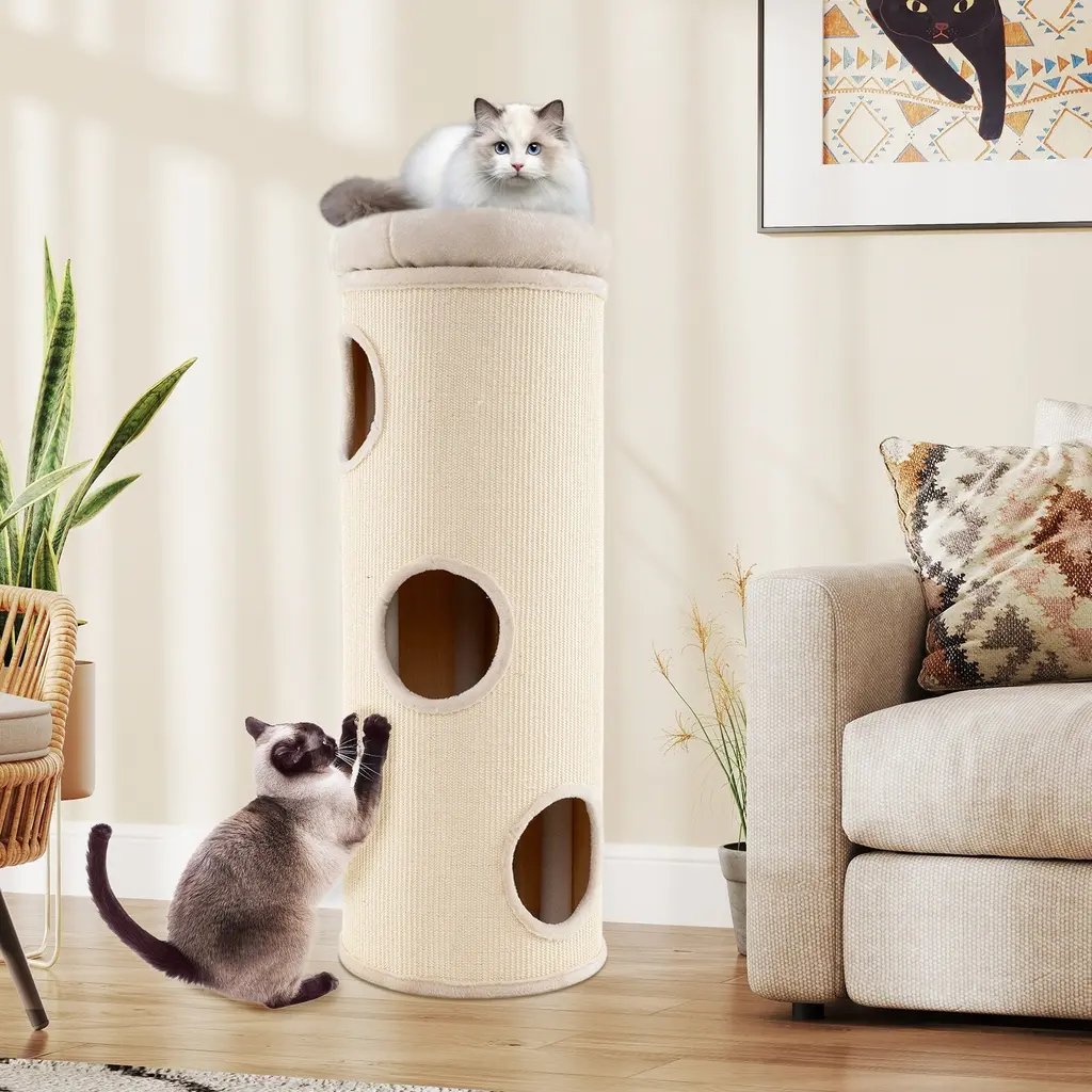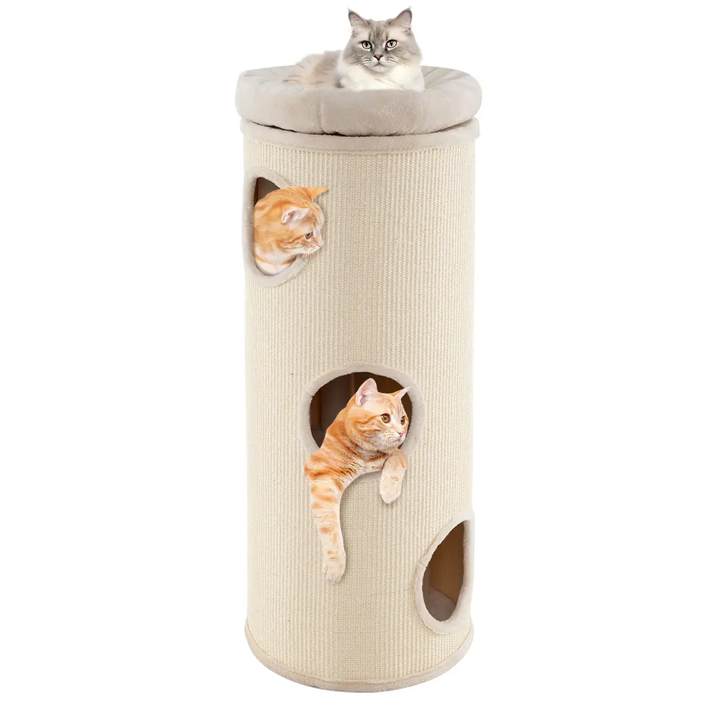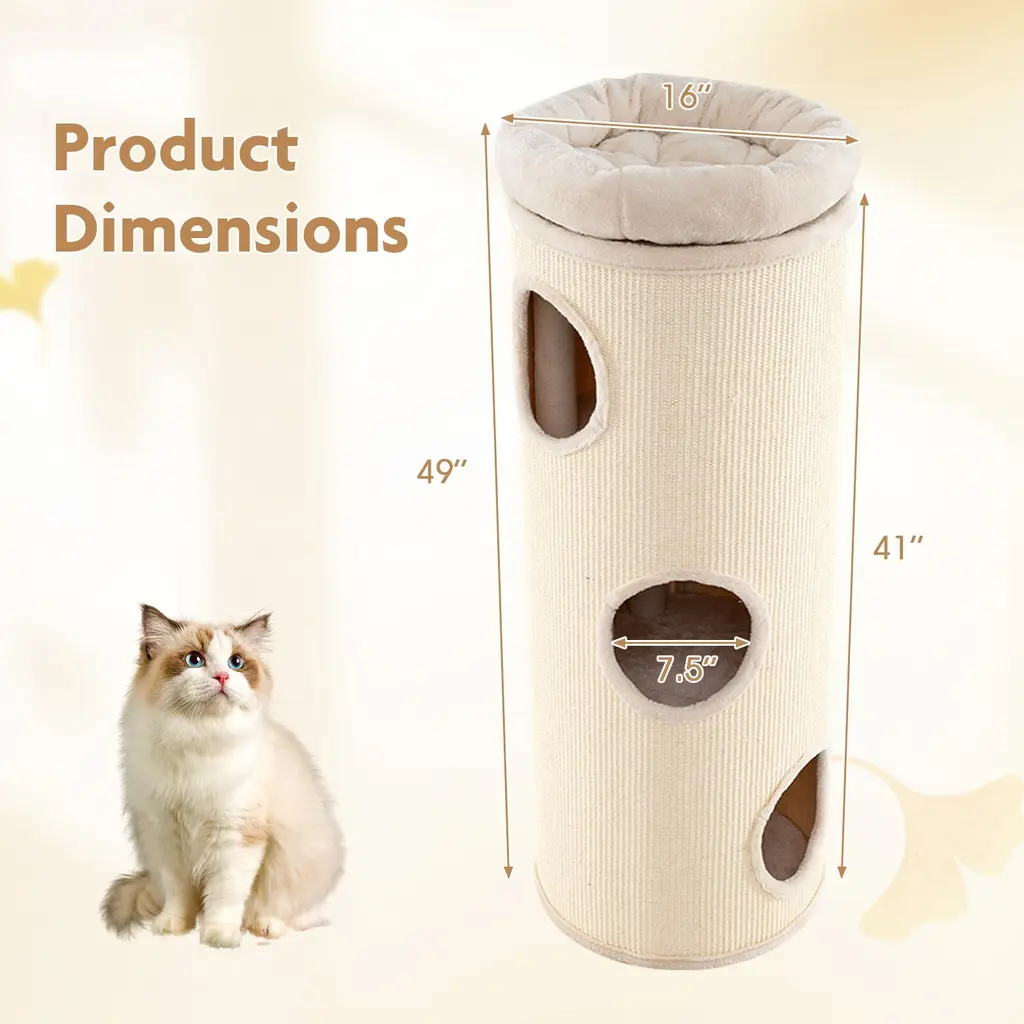 SpecificationsDescription:This 4-story cat house offers a dynamic space for multiple cats to play, rest, and explore, featuring three entrance holes per level for easy movement between floors. Its versatile 2-in-1 design allows the sidewalls to be detached for simple cleaning, and the elevated cave bed can transform into a multi-level tower for cats to survey their environment from various heights. The barrel-shaped structure includes a natural sisal scratching board to help cats maintain their claws while protecting your furniture, complemented by a wicker mat lining that provides a cooling, comfortable retreat. A removable, thick plush perch adds cozy warmth and is machine washable for easy maintenance. Designed to maximize space with a compact footprint of 16" x 16" x 49", this vertical cat tower fits neatly into small areas and tight corners, making it an ideal solution for homes with limited floor space. Clear instructions simplify assembly, ensuring a quick setup of this multi-functional, engaging cat furniture.