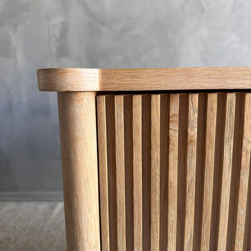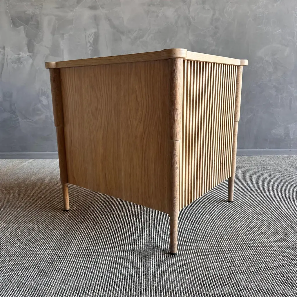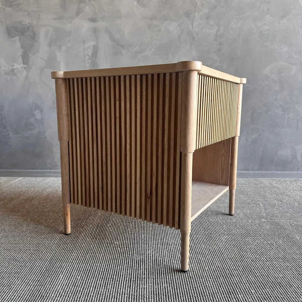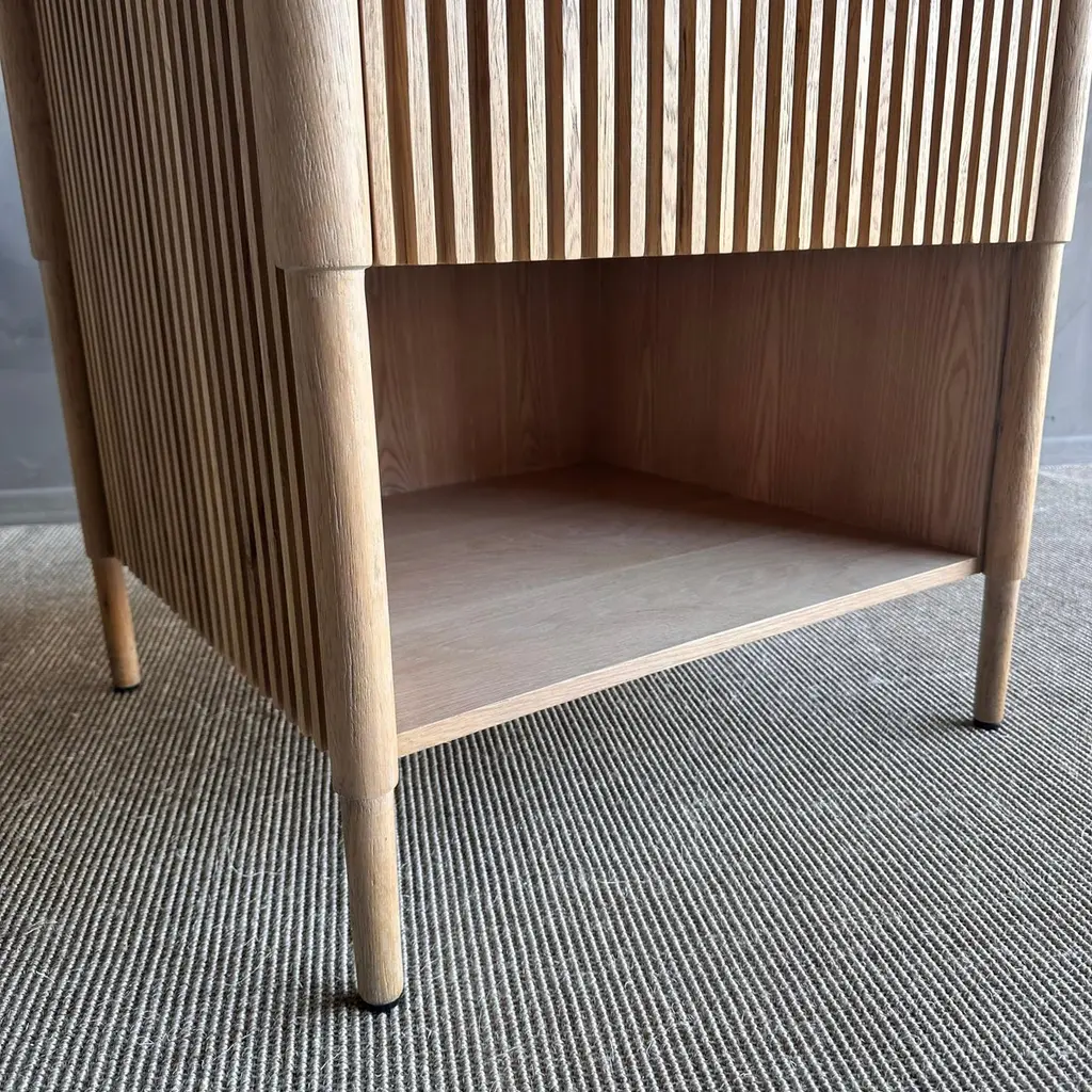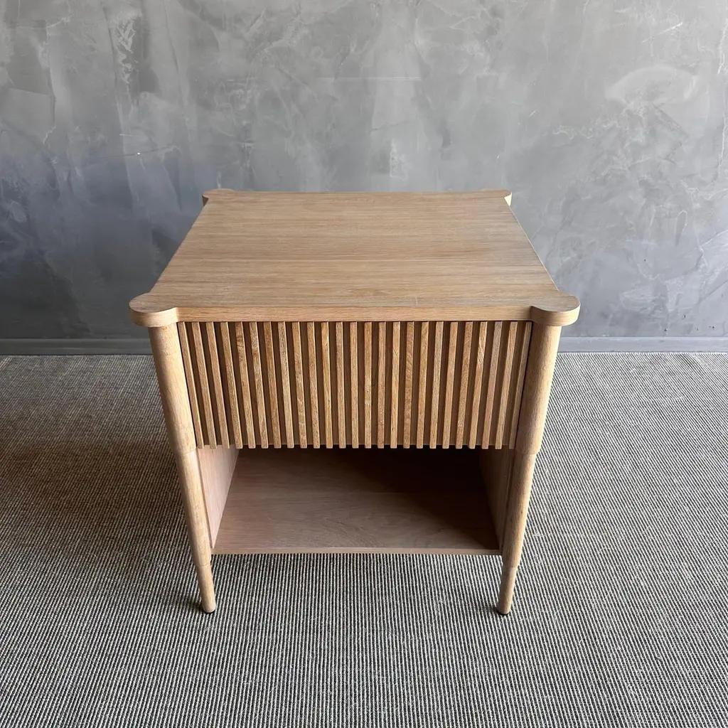 Introducing the Reed White Oak Nightstand, a timeless piece constructed from solid white oak with a natural finish. The reeded drawer front and sides add a touch of elegance and sophistication to any bedroom decor. Quality made, this nightstand features a soft close drawer for smooth and quiet operation, and tapered legs for added style. The addition of a shelf provides extra storage space for books, magazines, or bedside essentials. Bring a touch of elegance and modern functionality to your bedroom with the Reed White Oak Nightstand.Dimensions: 26" w x 21" d x 26.5" h