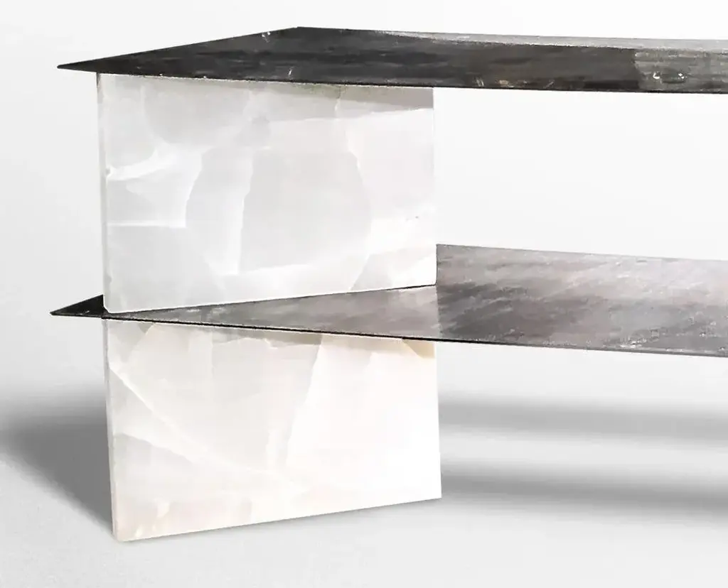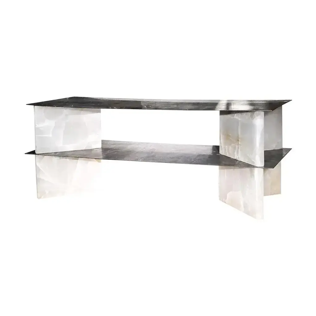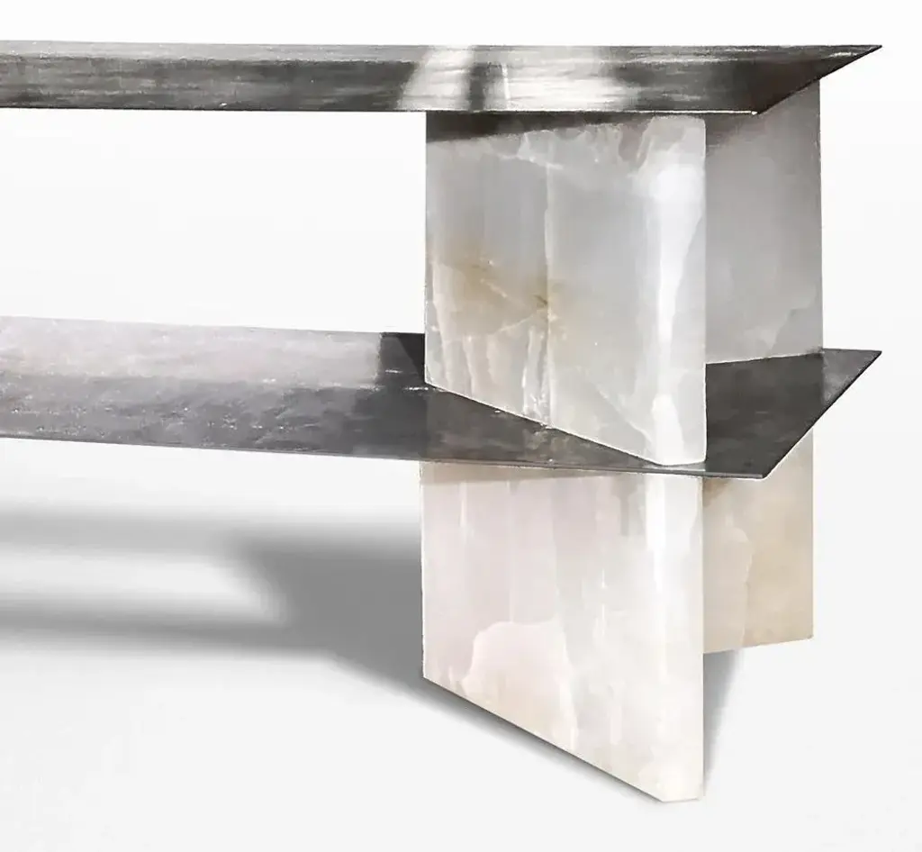 White Onyx Low Console by Studiopepe Dimensions: D 59 x W 153 x H 53 cm. Materials: White onyx and stainless steel. Multifaceted design agency Studiopepe was founded in Milan in 2006. Eclectic, voguish, it is the brainchild of Chiara di Pinto and Arianna Lelli Mami, both of whom obtained their degrees in Industrial Design at the Milan Polytechnic University. Driven by their own distinctive multidimensional vision that arose from their studies in Interior and Industrial design, their studio work encompasses art direction, styling, interior, and product design, with an integral vein of storytelling that connects everything together. Drawing inspiration from the unexpected, their contemporarily classic designs are characterized by their equally minimalist and eclectic nature, uniting poetic vision and rigorous design. Studiopepe studies the dialogue between contrast and juxtaposition, with experimentation of materials, investigation of formal archetypes, installations, and art manifesting as integral themes to their work. Their projects are recognizable by their strong iconographic identity, formed through the cross-pollination of contemporary mediums and artistic disciplines as well as extensive research of colors and materials. Arianna Lelli Mami has always been fascinated by the ways people live and inhabit space, considering design from a fluid perspective, free from rigid schemes. Passionate about art, she collects ‘objets trouvés’ that are then re-explored and utilized to create installations that often inspire projects for the agency. Chiara Di Pinto received academic training in fine arts and has collaborated as an interior stylist and journalist for many Italian and international magazines. Due to her innate artistic intuition, she has always had a strong interest in materials, shapes, and colors, shaping her instinctive approach to design and love of research.