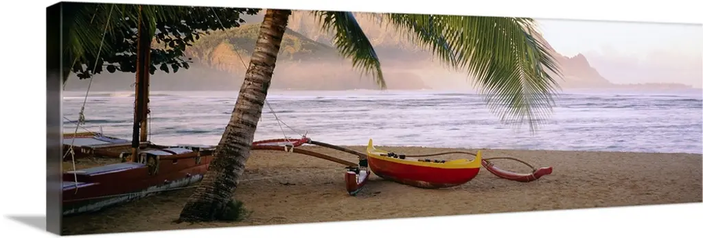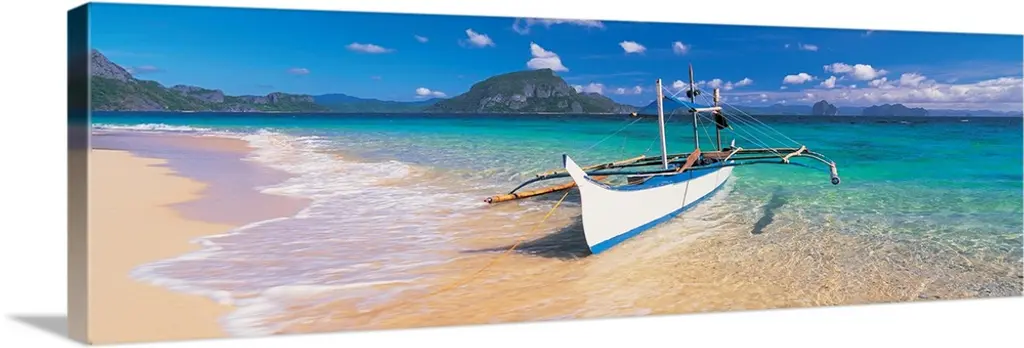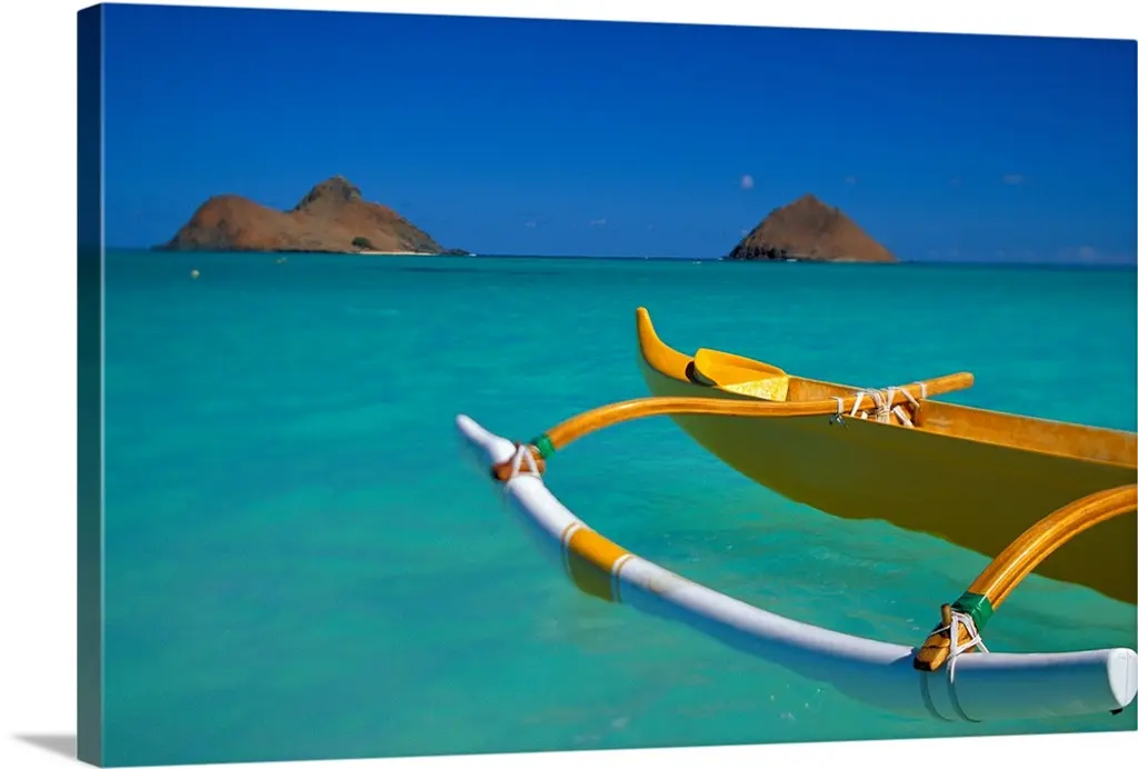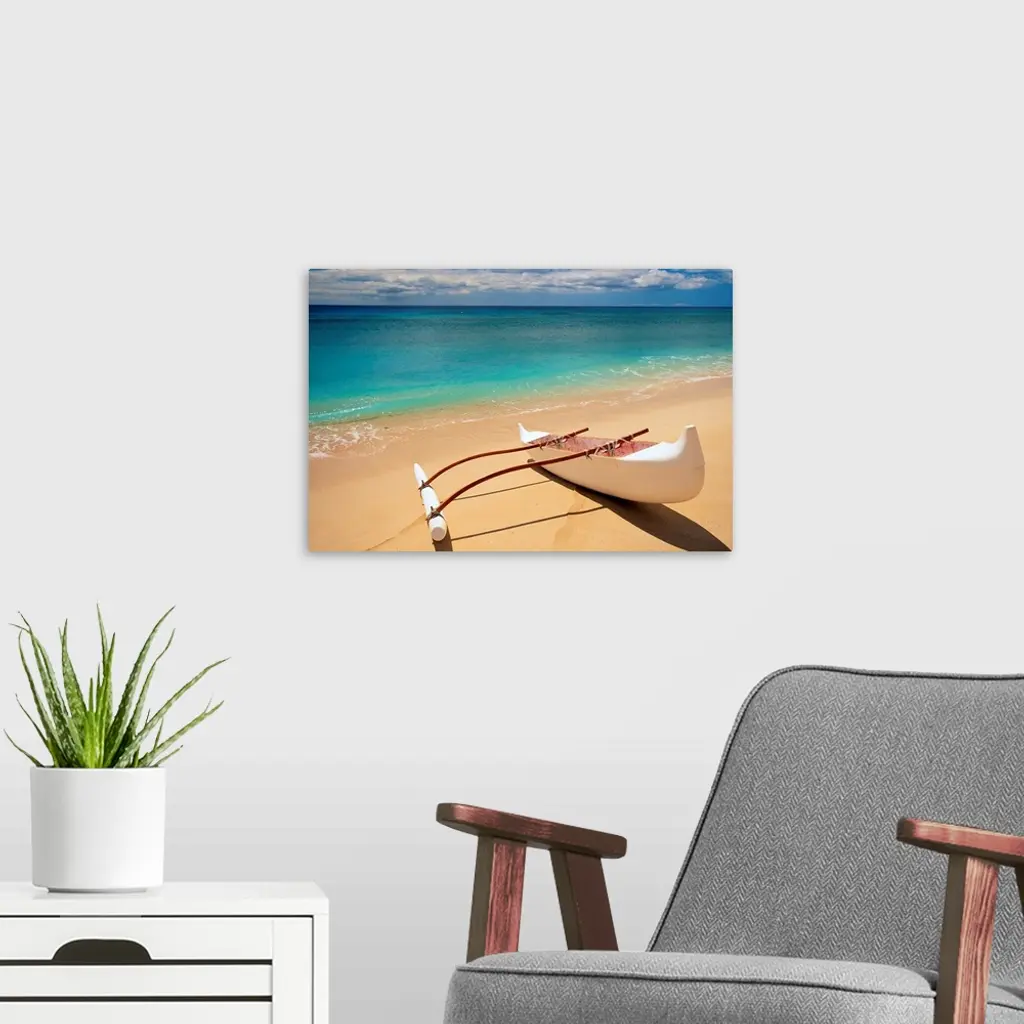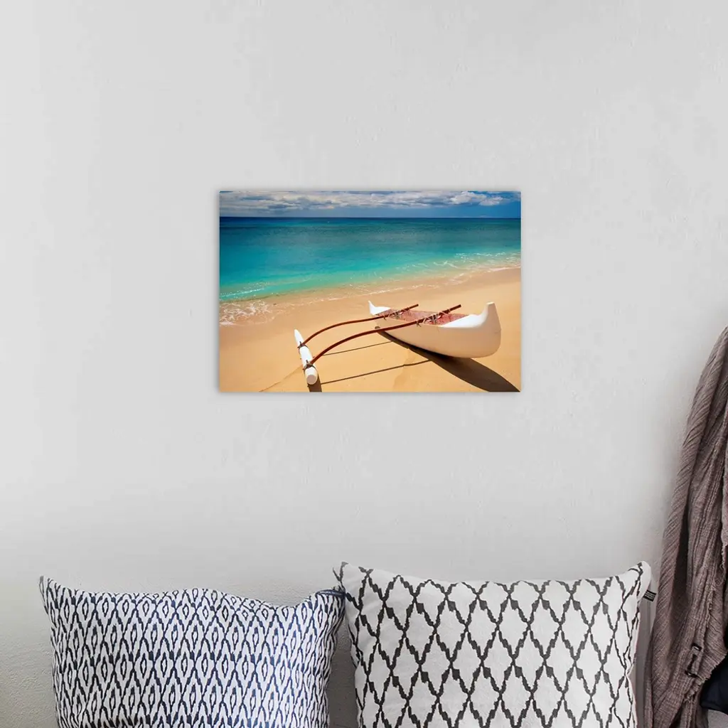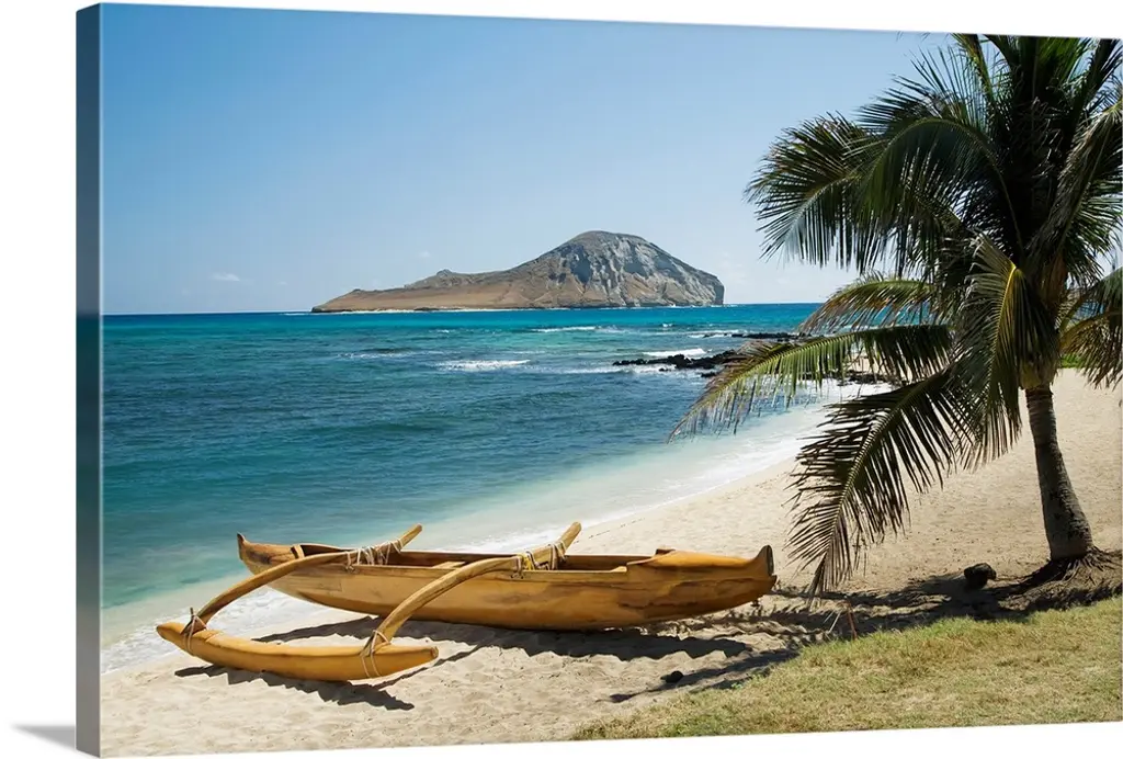 Horizontal canvas of a canoe sitting on a beach with crystal clear water washing ashore from the ocean.