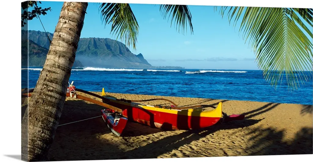 White Outrigger Canoe On Shoreline With Shadow, Calm Turquoise Water