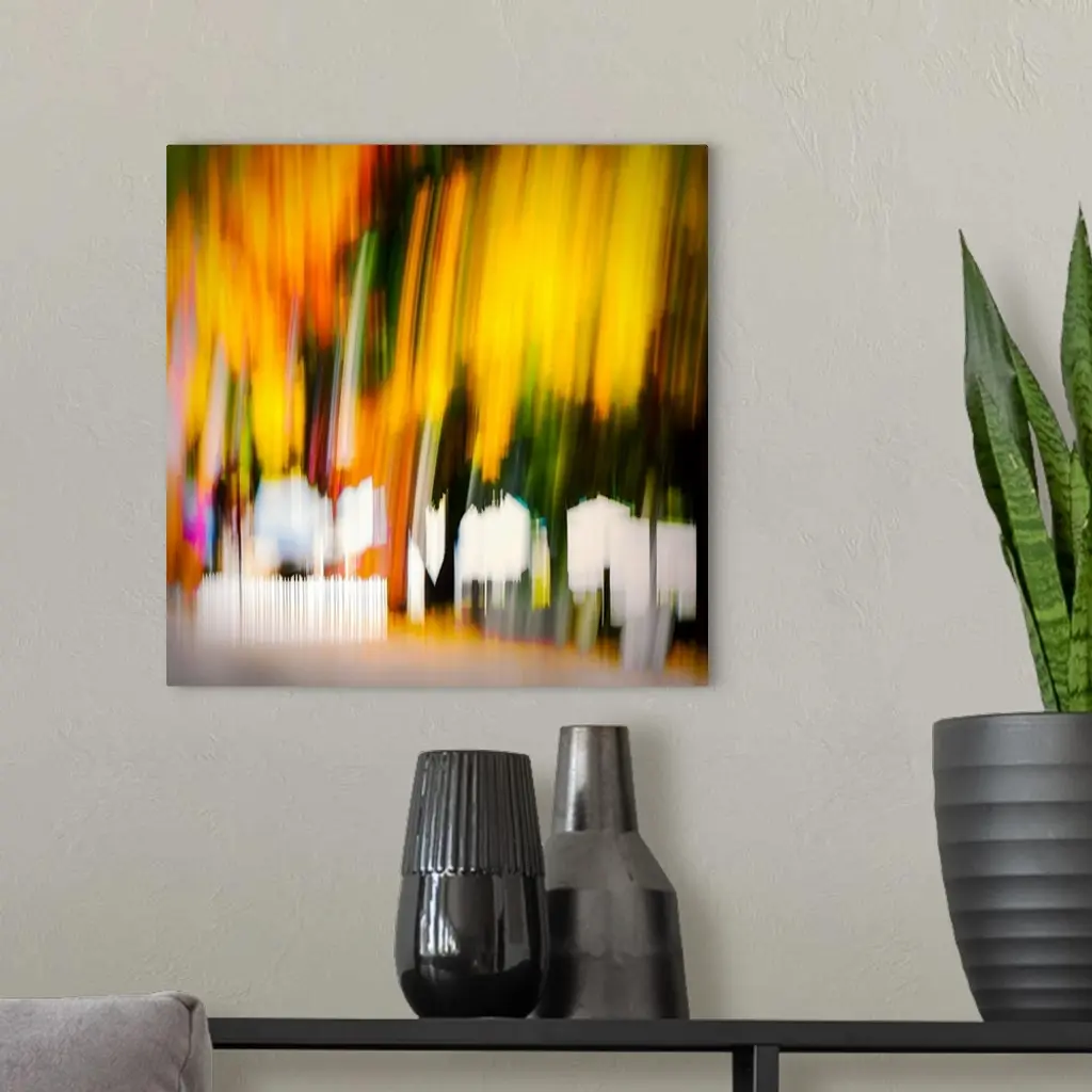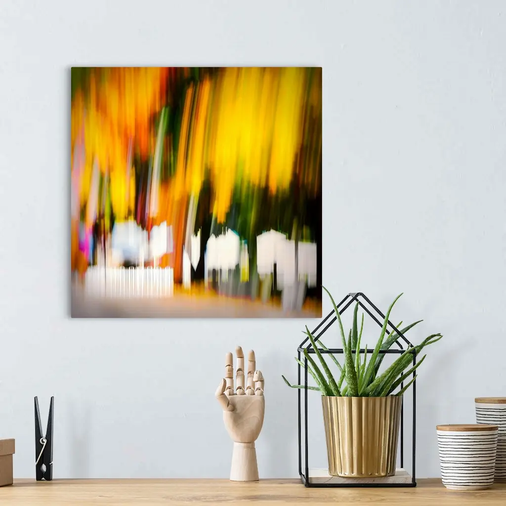 Abstract photography - the image was made using the ICM (Intentional Camera Movement) technique. It shows a group of trees in full Fall glory, behind the trees a white house, in front a picket fence. Ursula Abresch Abstract Trees Collection.