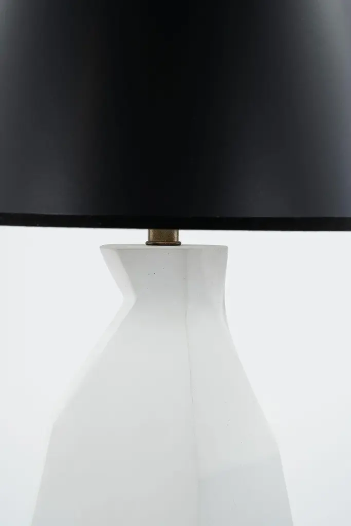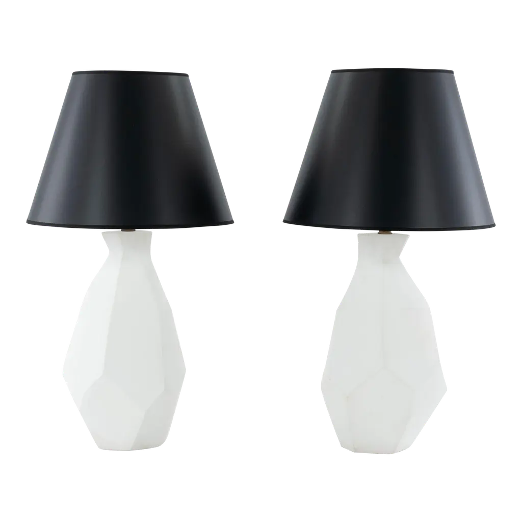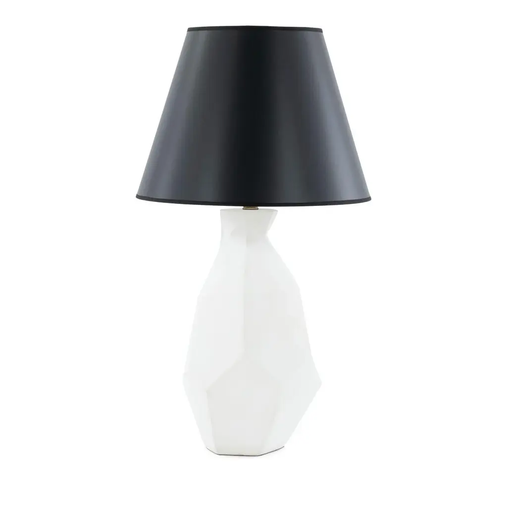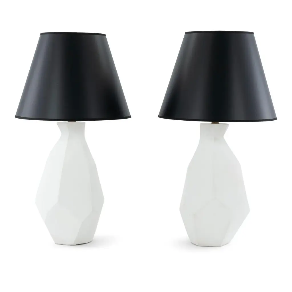White plaster lamp in the style of Giacometti, by Liz Marsh, newly wired for use within the USA using UL listed parts. Dimmer switch and complementary black paper shade included. Listed measurements include shade. Two lamps available but sold separately priced $2,400 each.