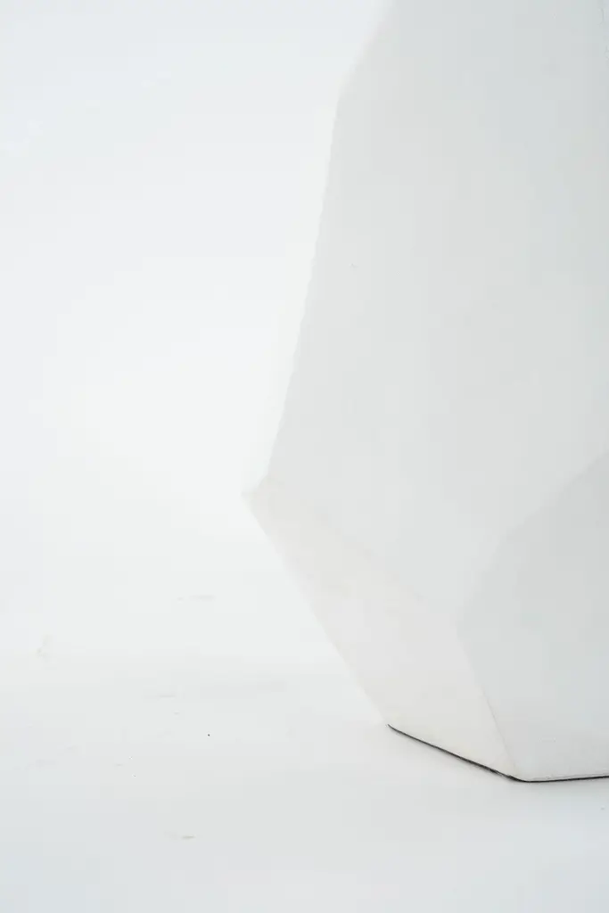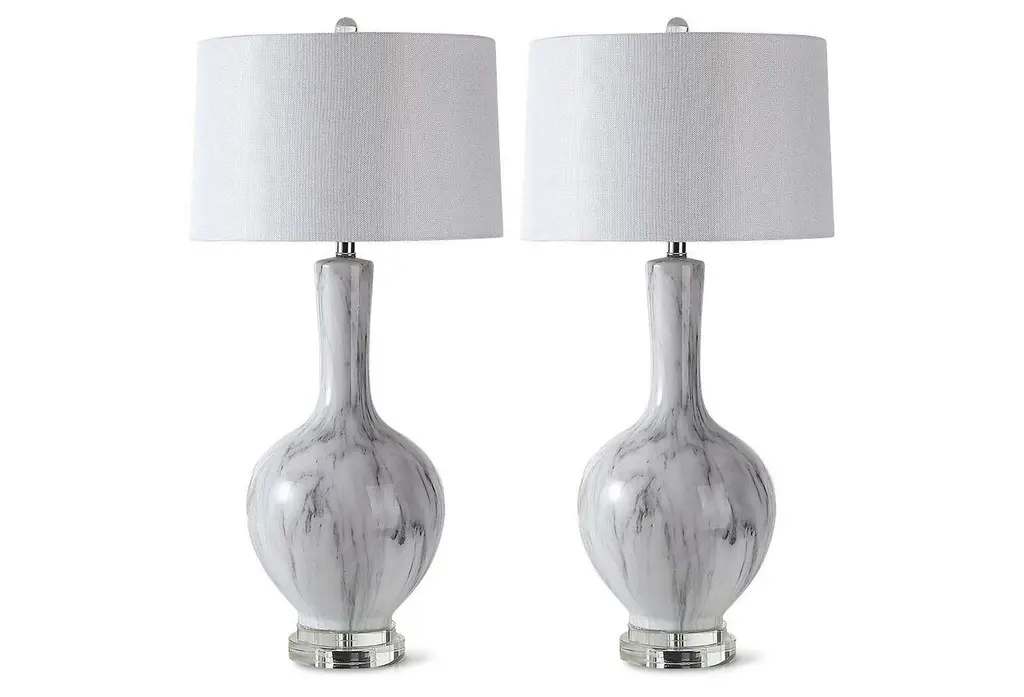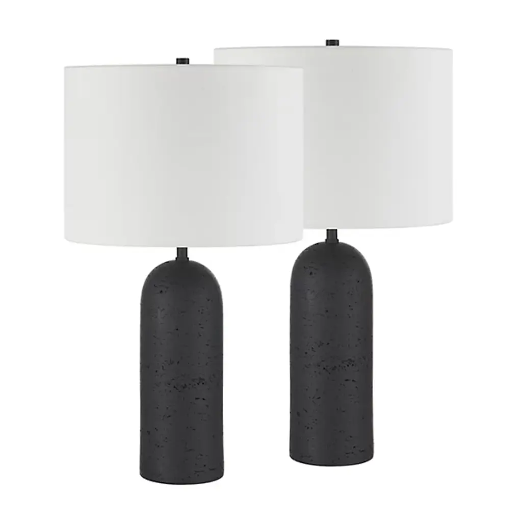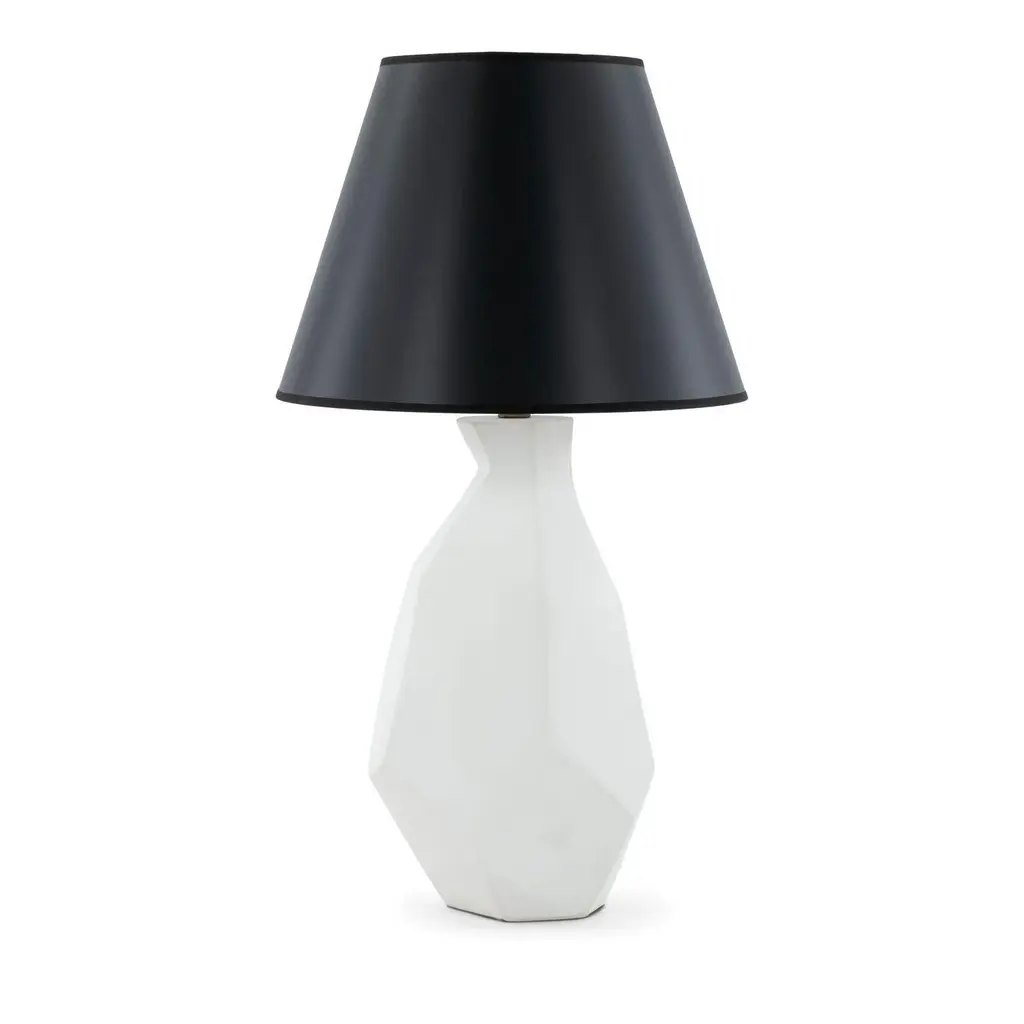 White plaster lamp in the style of Giacometti, by Liz Marsh, newly wired for use within the USA using UL listed parts. Dimmer switch and complementary black paper shade included. Listed measurements include shade. Two lamps available but sold separately priced $2,400 each.