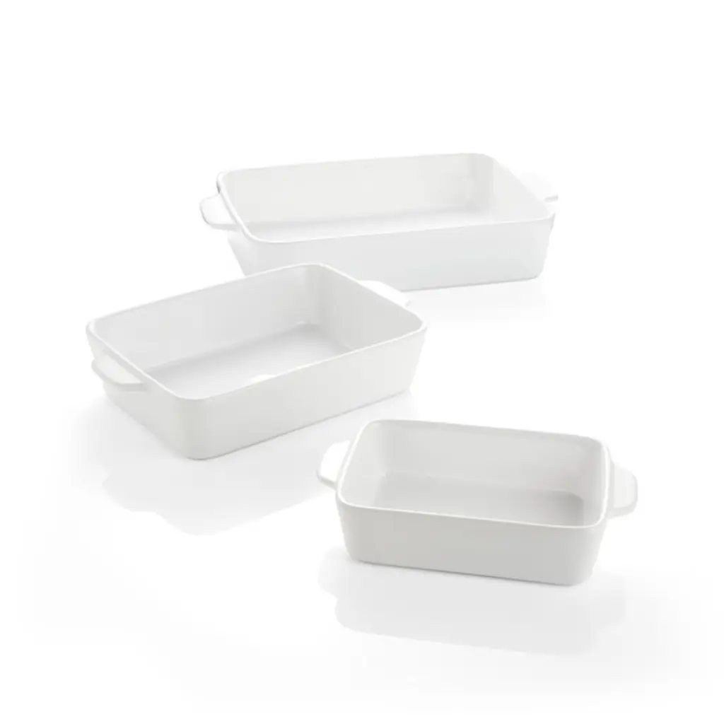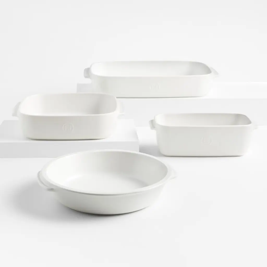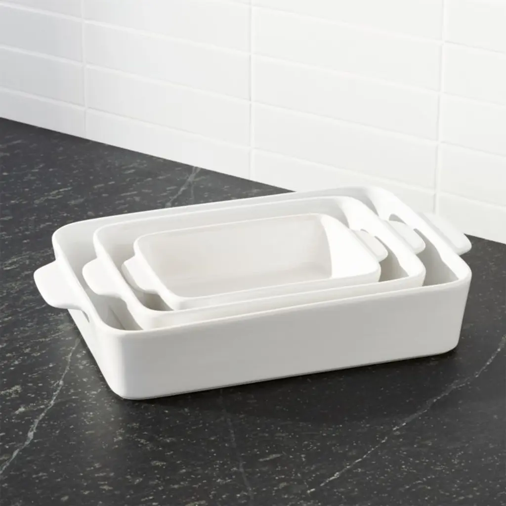 You'll turn to our clean, white baking dishes time and again for daily meals, potluck dinner parties and holiday desserts. This set of three nesting stoneware bakers, a Crate and Barrel exclusive, transitions easily from oven to table and cleans up easily in the dishwasher. Understated handles make for easy carrying.