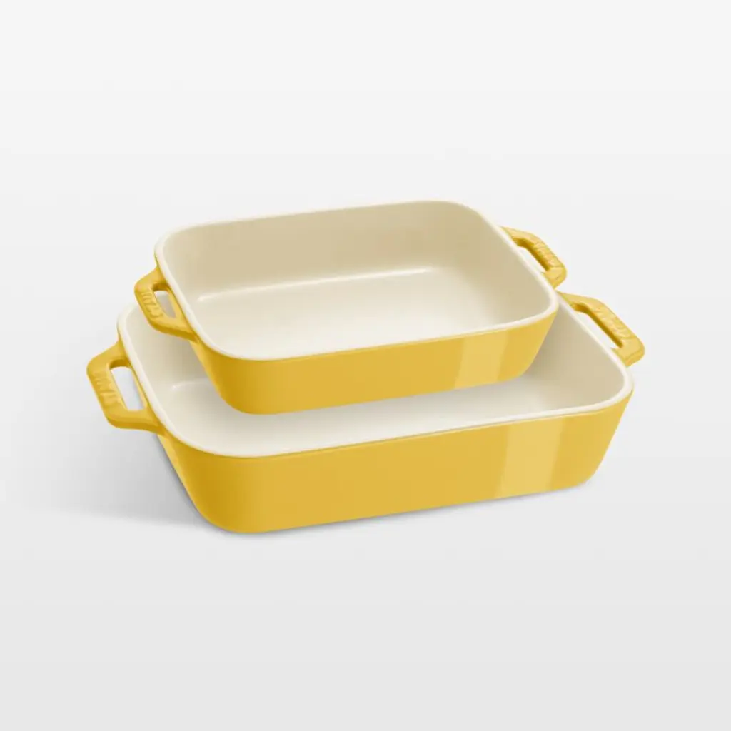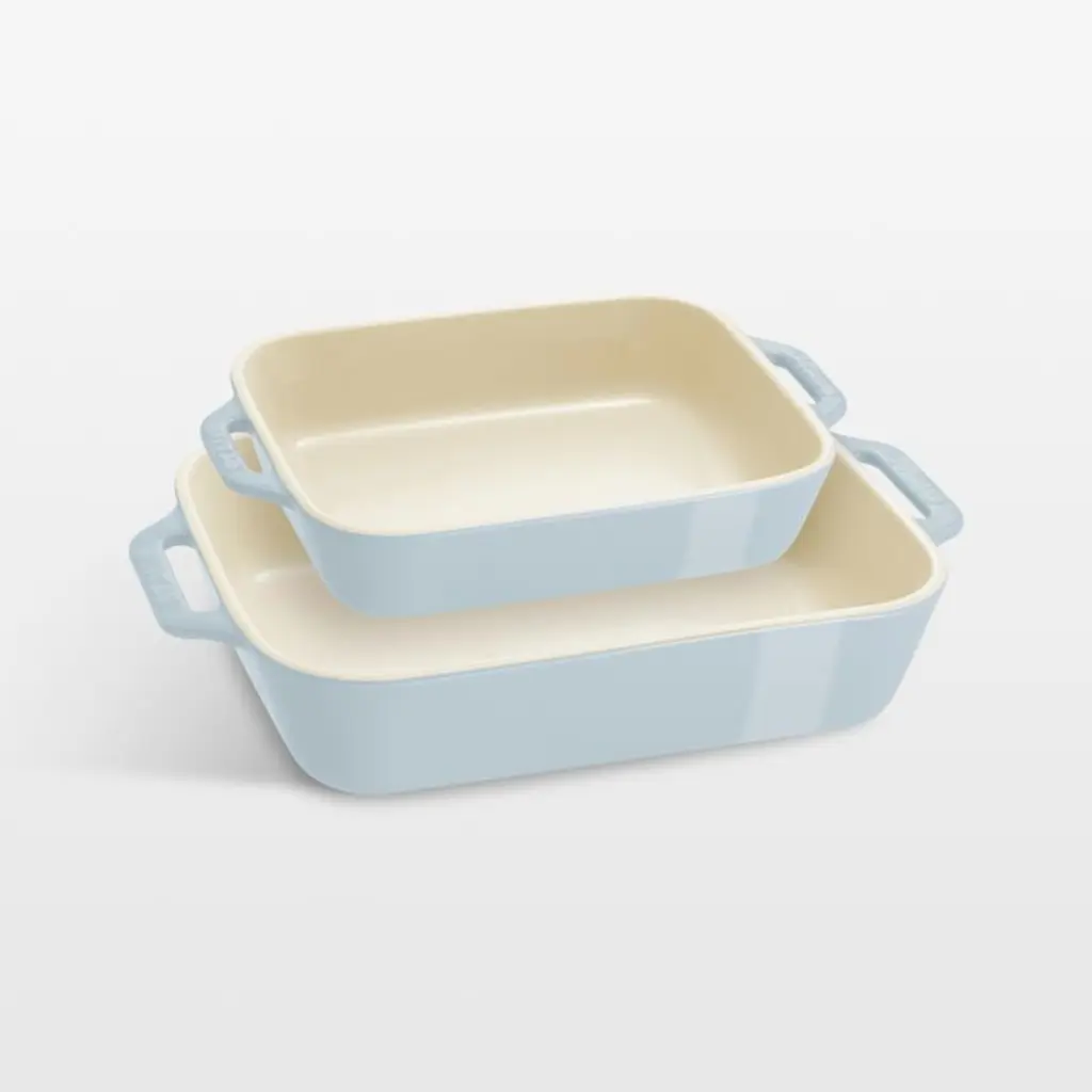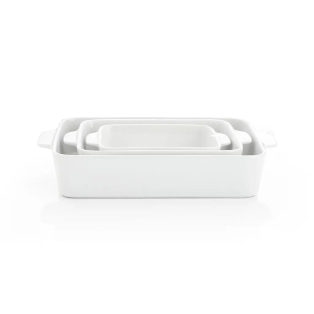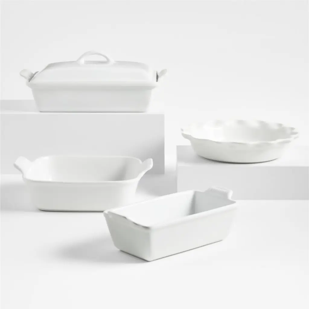 You'll turn to our clean, white baking dishes time and again for daily meals, potluck dinner parties and holiday desserts. This set of three nesting stoneware bakers, a Crate and Barrel exclusive, transitions easily from oven to table and cleans up easily in the dishwasher. Understated handles make for easy carrying.
