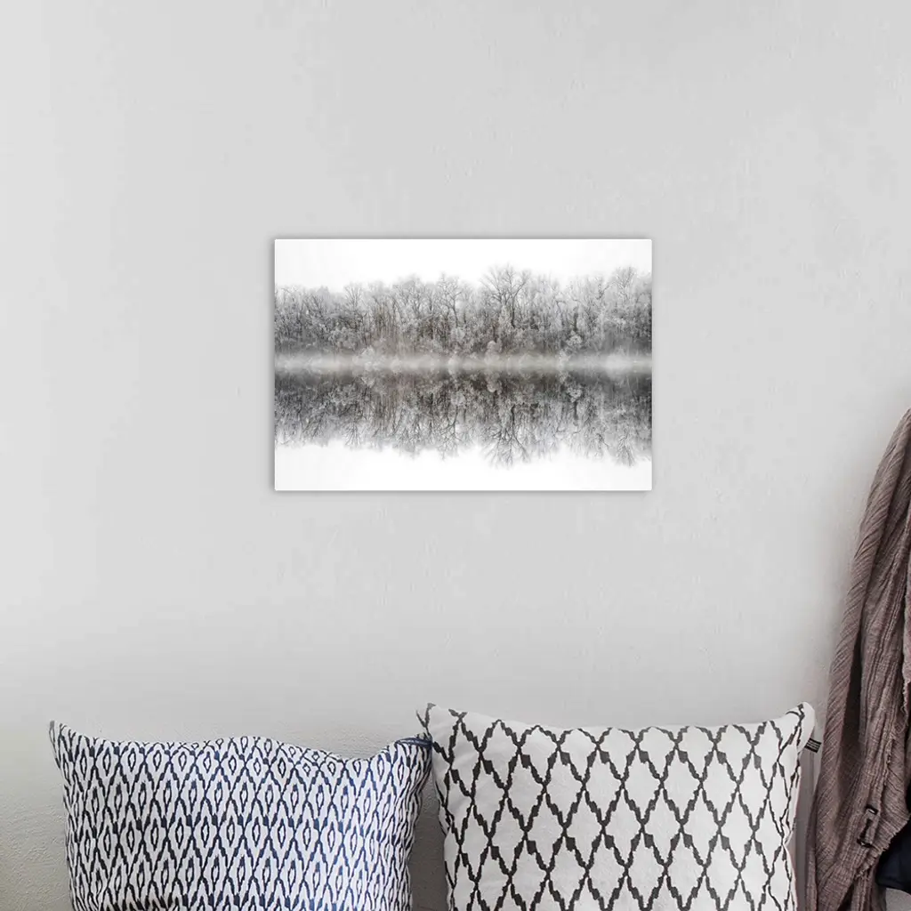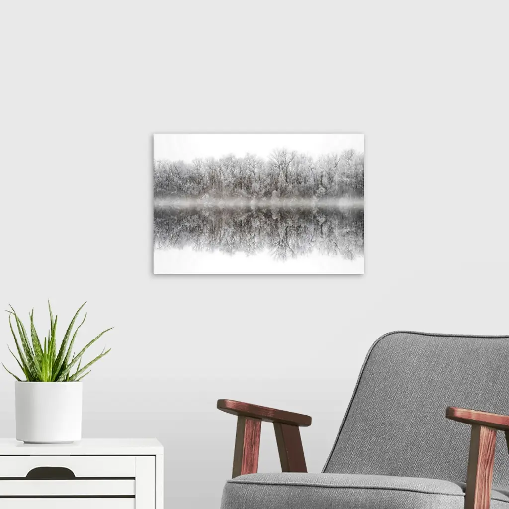 Photograph of a snow frozen line of trees reflecting below a foggy line.