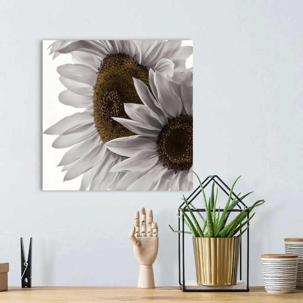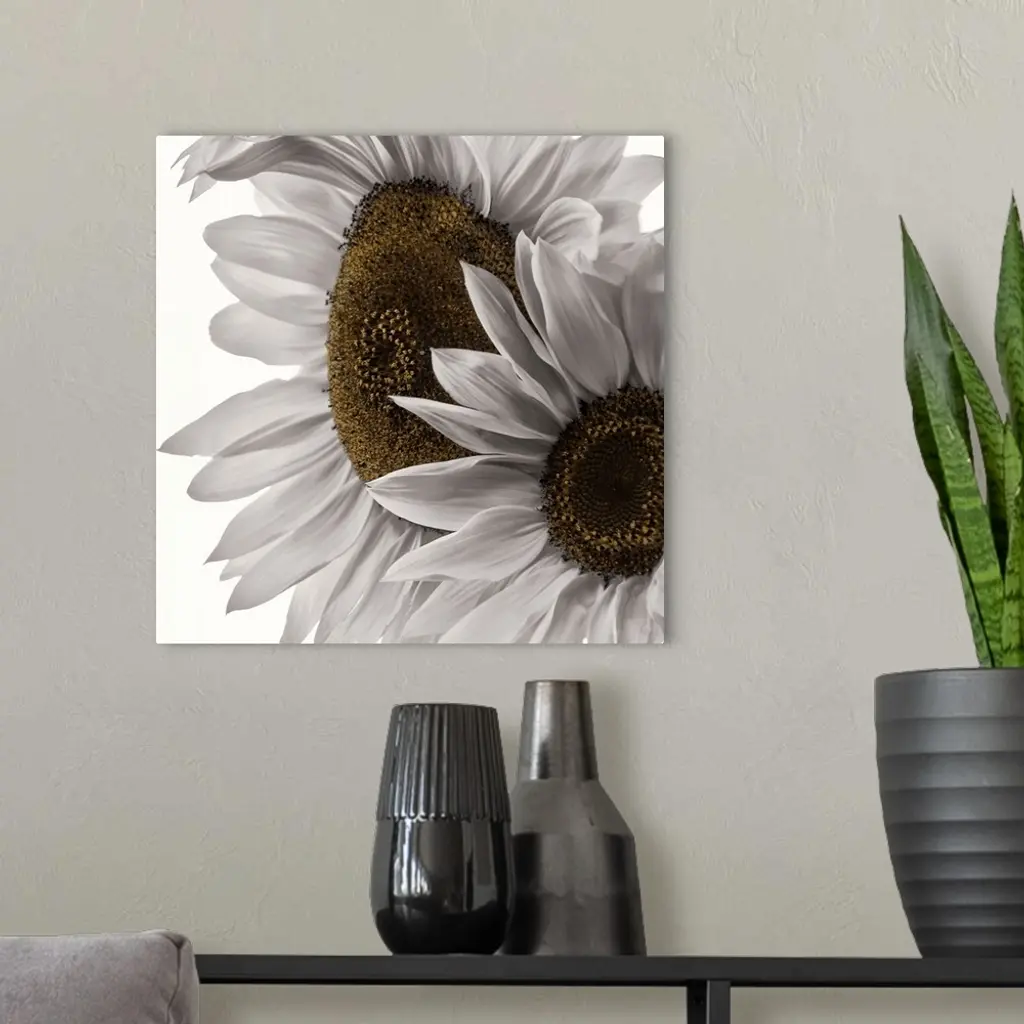 Two colorless sunflowers photographed in front of a blank backdrop.