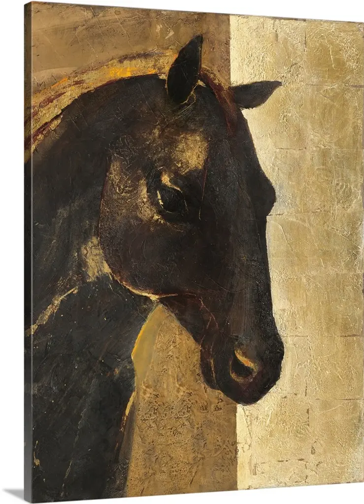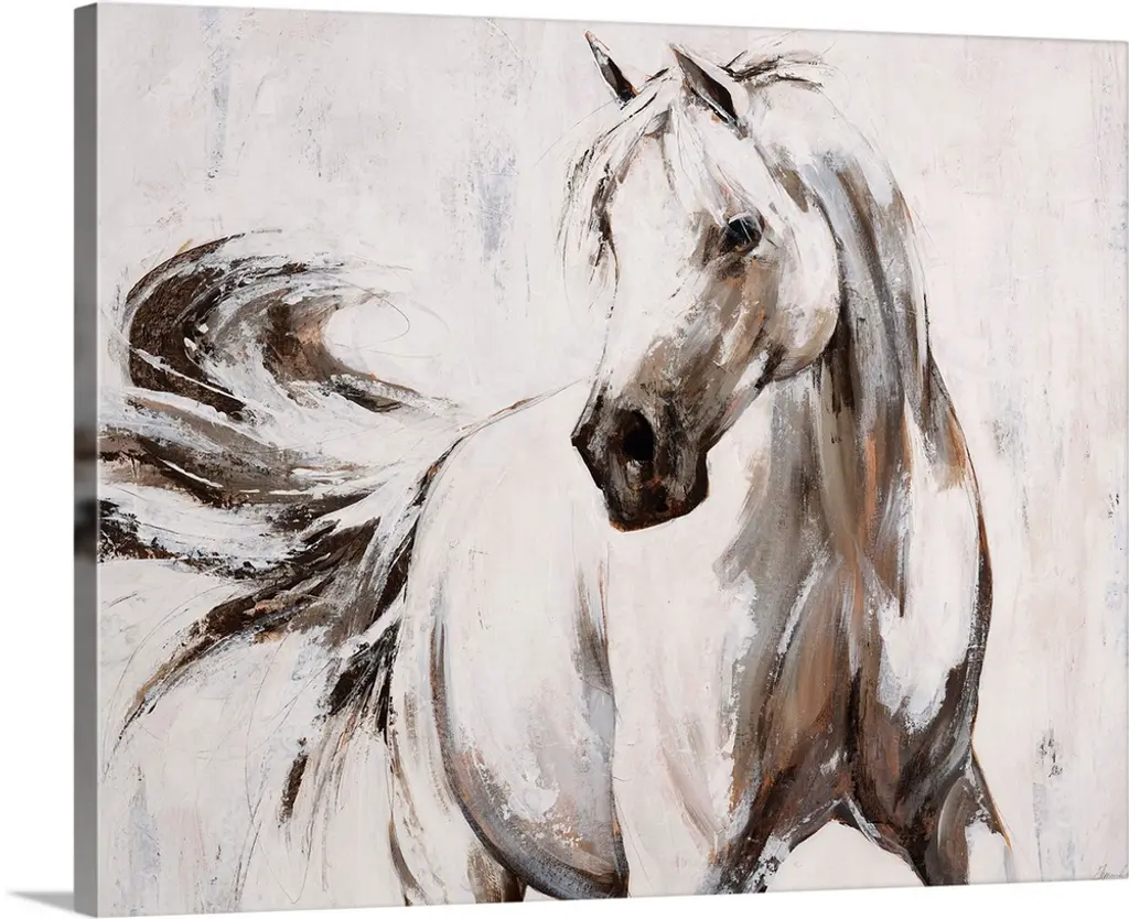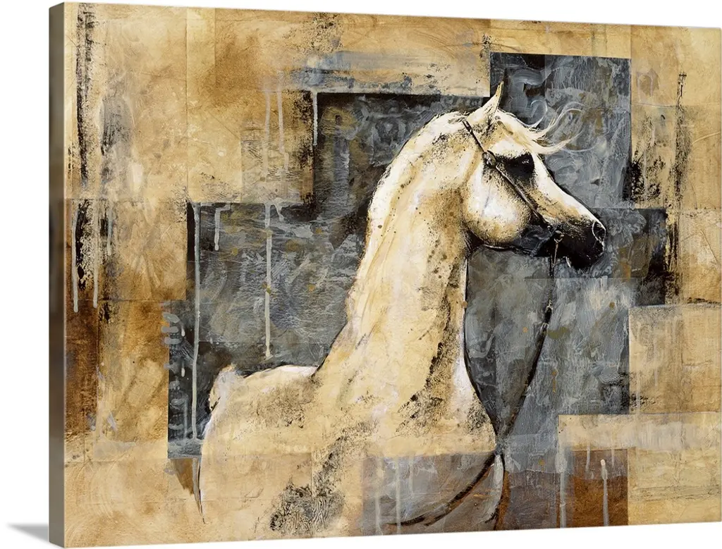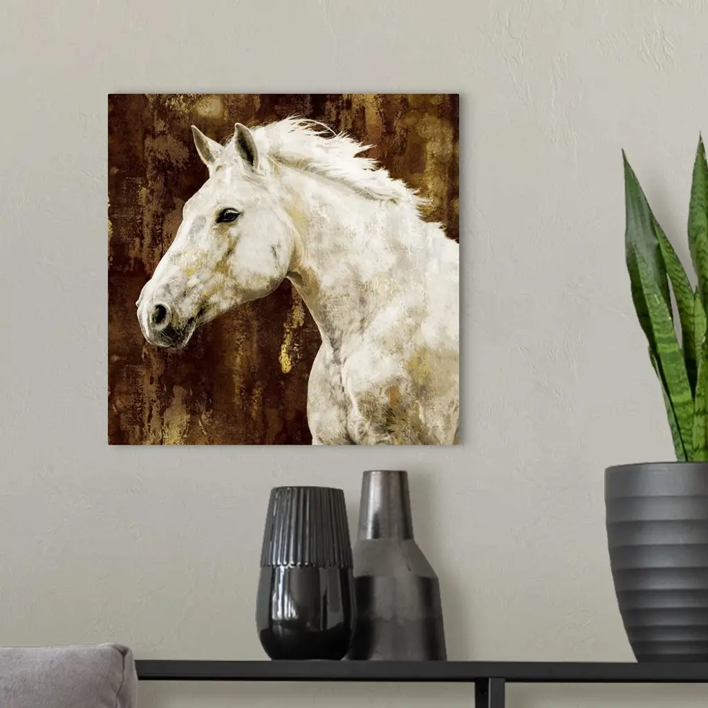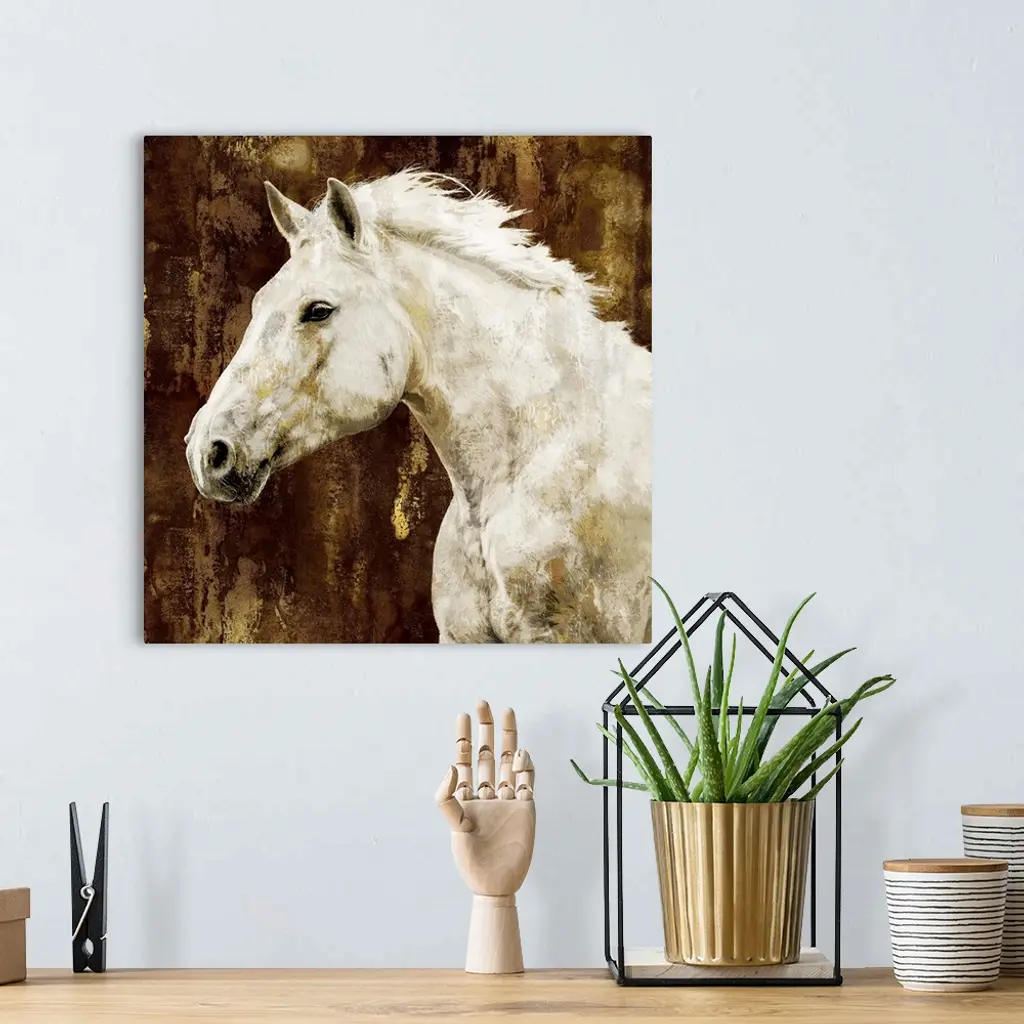 Square decor of a white stallion with its head down on a silver background and gold streaks running over the top.