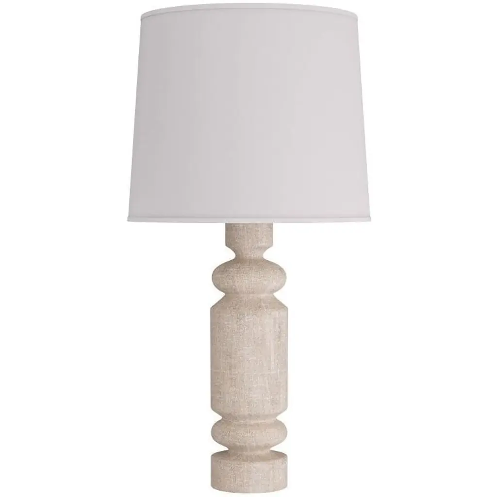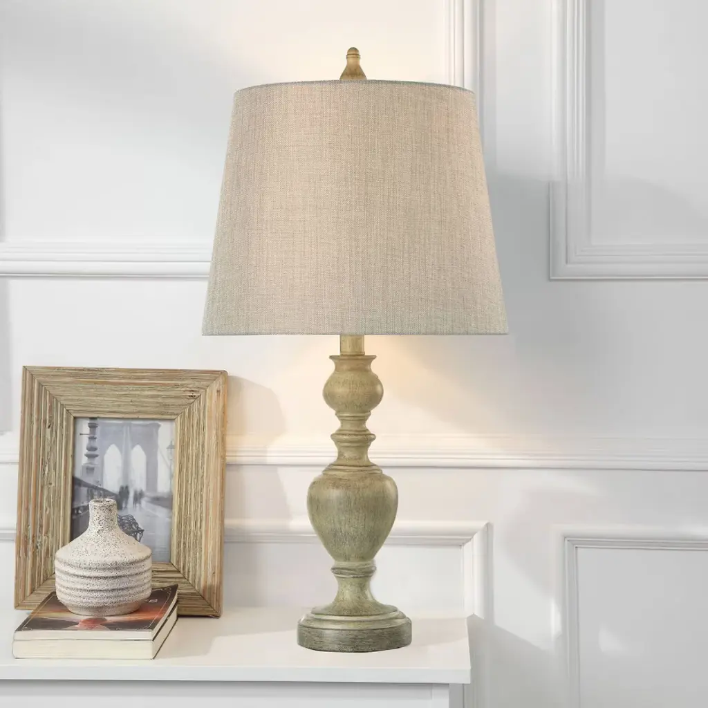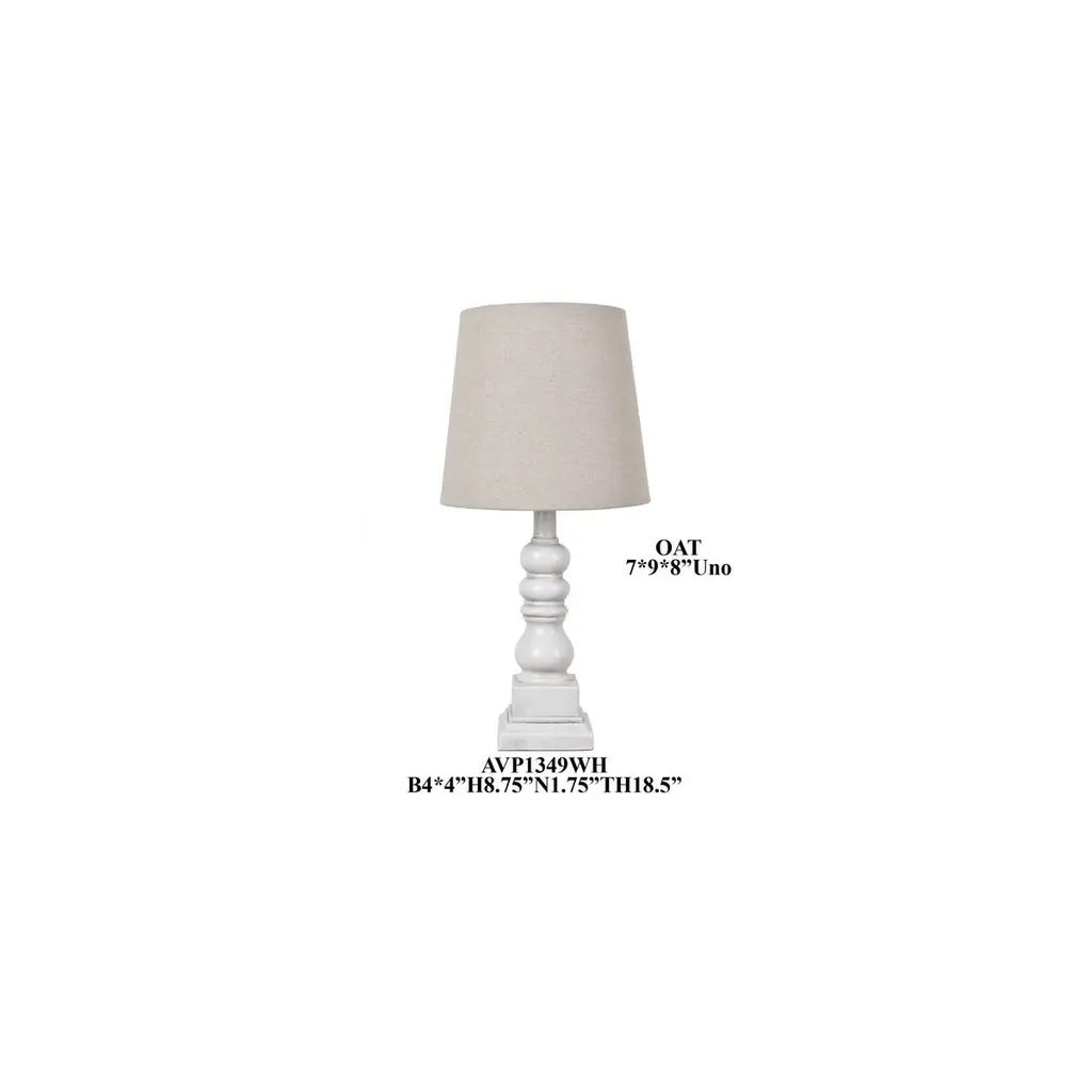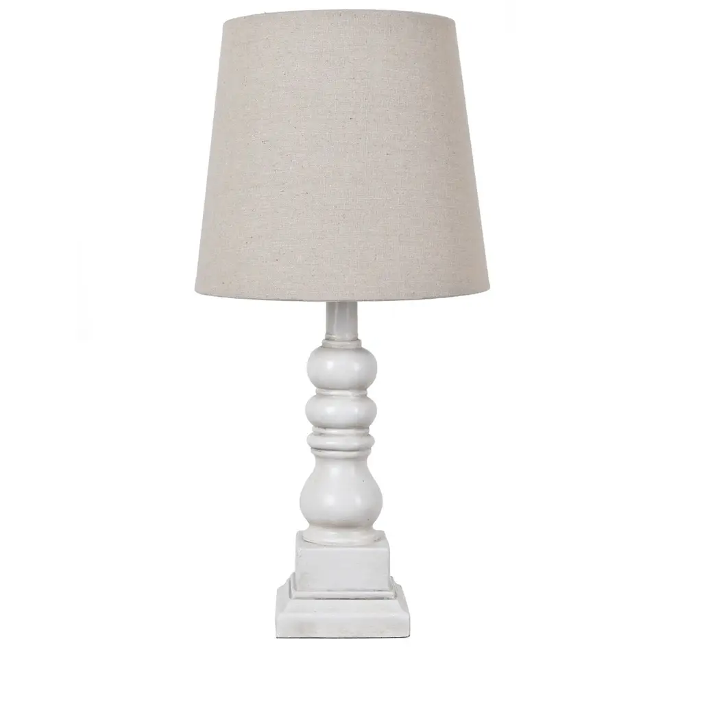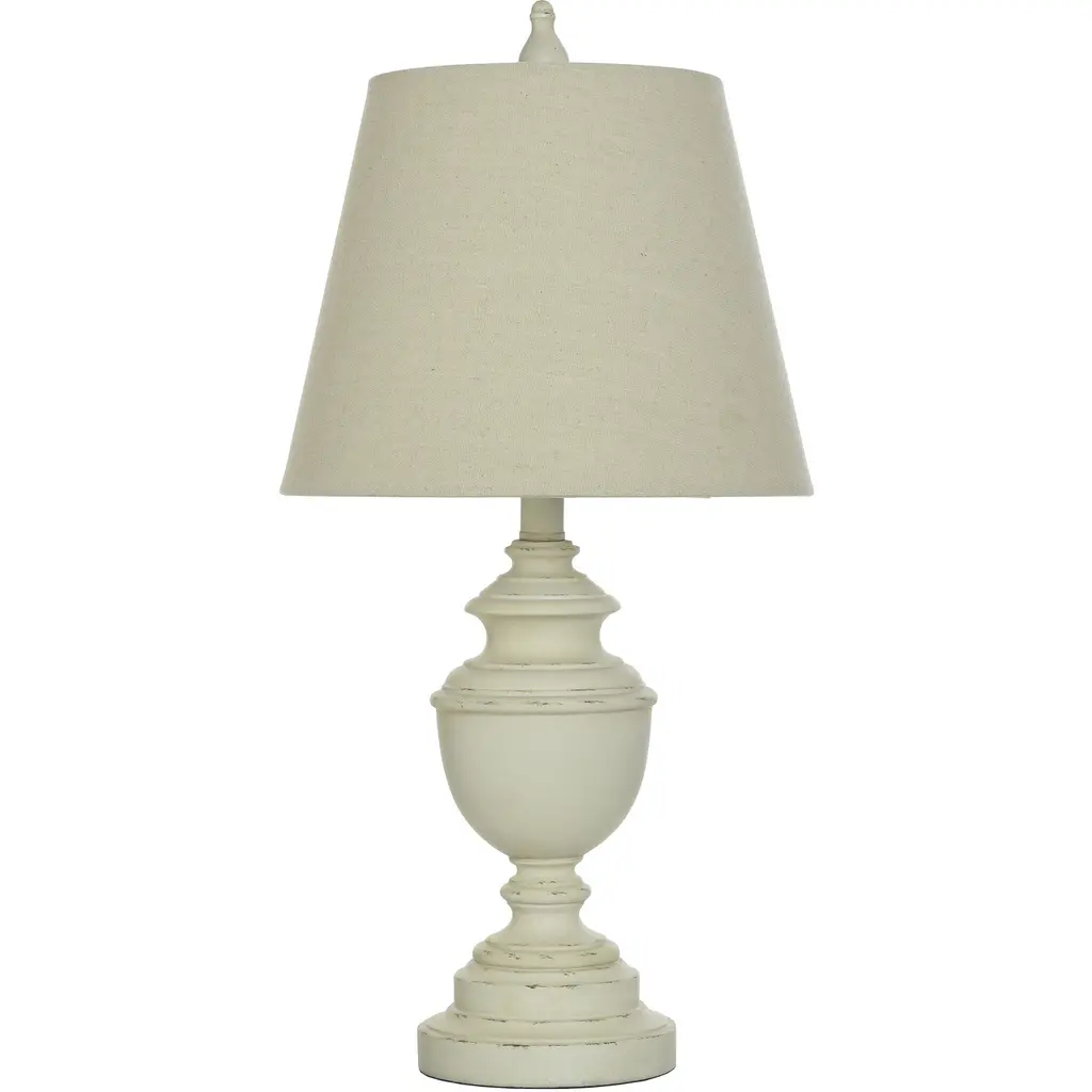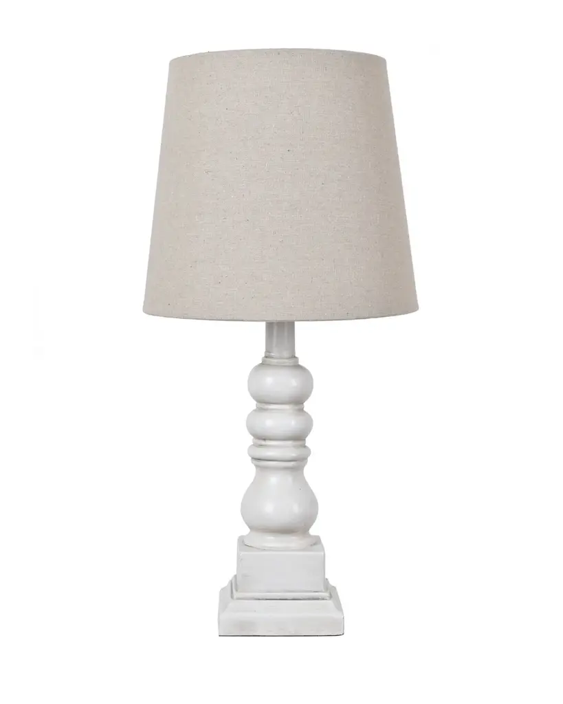 Cast an illuminating glow in your living room or bedroom with this 19" traditional table lamp. Crafted from resin (a plastic material), this piece features sculpted contours and a distressed finish that easily blends in with your favorite chair or sofa. A tapered drum linen shade sits atop the lamp adding style and subtle color. Underneath the shade, it houses one 40W medium-base bulb (not included), that aims light in multiple directions, giving your space a boost of brightness. Dimensions 9"W x 9"D x 18.5"H, Crafted of resin, Hand finished white, Cord Length: 60" clear cord, Uses (1) 100 watt bulb max, Oatmeal linen shade 7"L x 9"W x 8"H.