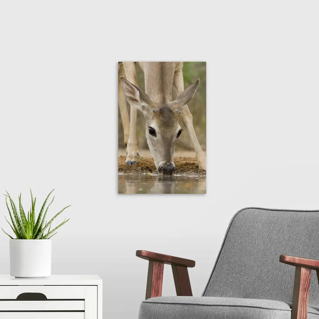 Santa Clara Ranch, Rio Grande Valley, McCook, Texas, North America, USA. White-tailed Deer Drinking at a Pond (Odocoileus virginianus).