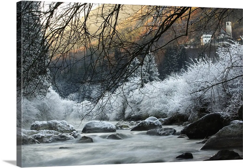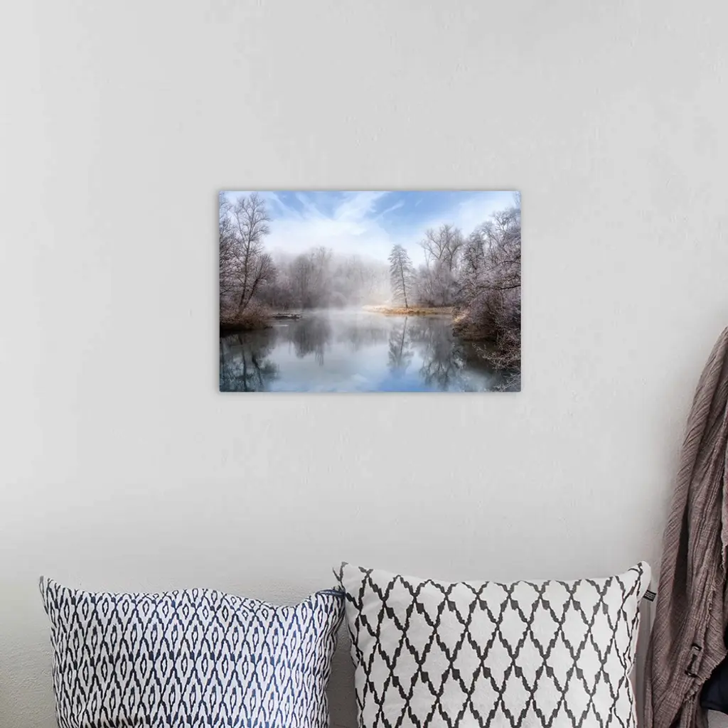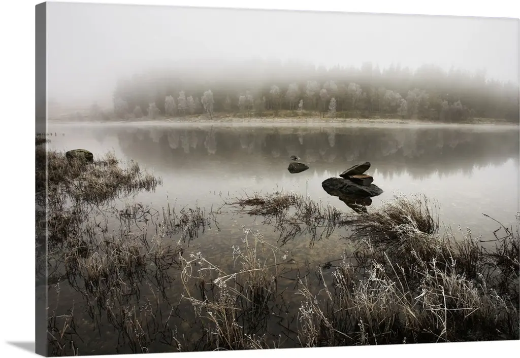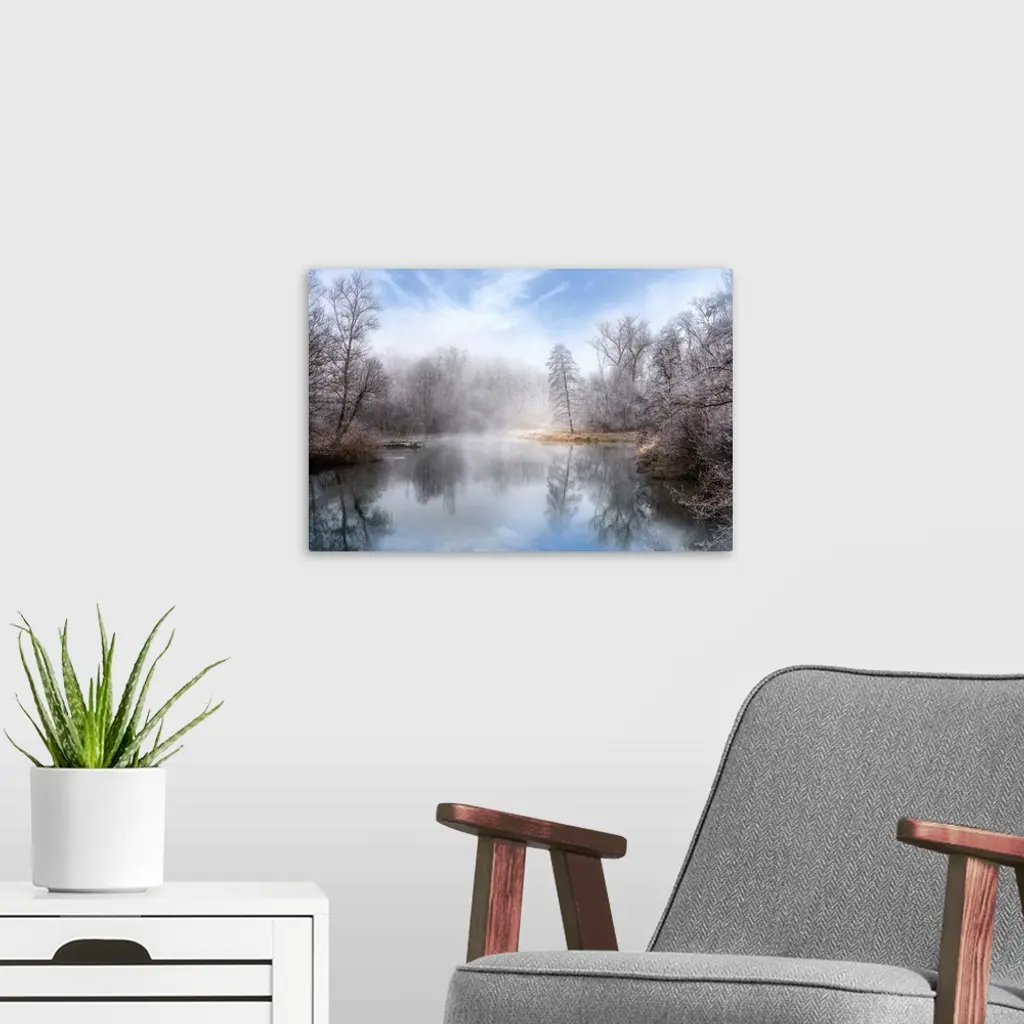 Photograph of a foggy lake surrounded by winter trees with icy branches.