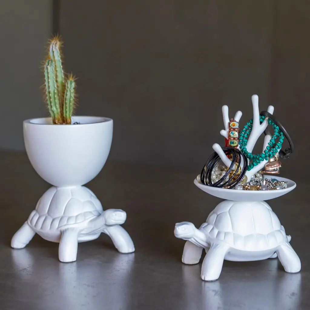 After the success of Turtle Carry, Marcantonio presents the iconic turtles in a small version.The turtle carapace supports a jewelry tree.Produced in white opaque resin, they catch the attention and they fit perfectly into any corner of the house.Made in Italy:Made in Italy furniture means design, quality, style and sophistication.The typical elegance of Italian design can be found in this piece. No wonder that the world famous designers like Philippe Starck, Karim Rashid, Piero Lissoni, Rodolfo Dordoni and many others put their signature next to Made in Italy.