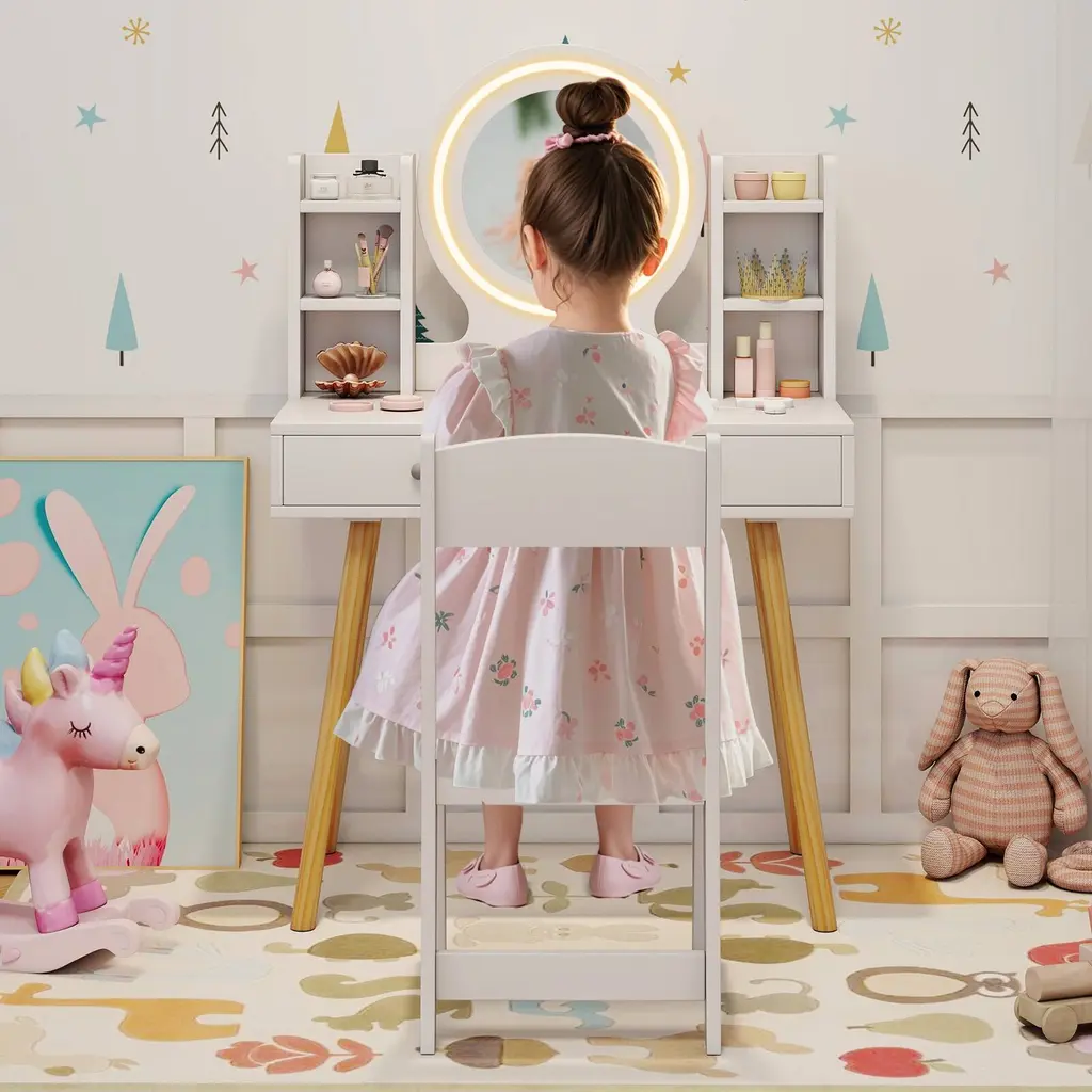 Specifications:Description: This charming white kids' makeup vanity with LED lighted mirror brings imaginative play to life with dual color settings in white and yellow (requires 3 AA batteries, not included). Designed for safety, it features a shatterproof PVC mirror, rounded corners, and an anti-toppling device for added stability. The sturdy construction, including solid pine wood legs and a durable MDF frame, supports up to 110 lbs on the tabletop and 165 lbs on the chair. With four open shelves and two drawers, it offers generous storage for toys, books, art supplies, or beauty accessories. Perfect for birthdays, holidays, or special occasions, this versatile vanity doubles as a space for dressing, reading, writing, or creative play, making it a delightful addition to any child's room.Key Features:● LED Lighted Makeup Mirror: This kids dressing table is designed with a mirror and lights to brighten up your child's imaginative play, which features 2 color settings—white and yellow. Note: Require 3 AA batteries (not included).● Child-Safe Features: This princess vanity set is safe for children and features a shatterproof PVC mirror to withstand playful interactions. Rounded corners minimize the risk of bumps and bruises, ensuring a safer play environment for your little ones.● Large Storage Capacity: This kids makeup vanity set comes with 4 open shelves and 2 drawers, offering ample space to store cosmetics, snacks, toys, books, stationery, art supplies, or beauty accessories.● Stability and Security: Equipped with an anti-toppling device, this kids makeup desk set can be attached to the wall to prevent tip-over accidents. The solid pine wood legs and robust MDF frame ensure high weight capacity (tabletop: 110 lbs, chair: 165 lbs).● Perfect Gift for Kids: Ideal for birthdays, holidays, Christmas, or any special occasion, this multi-use kids vanity set is the ultimate delightful gift for your children, suitable for dressing, reading, writing, drawing, etc.