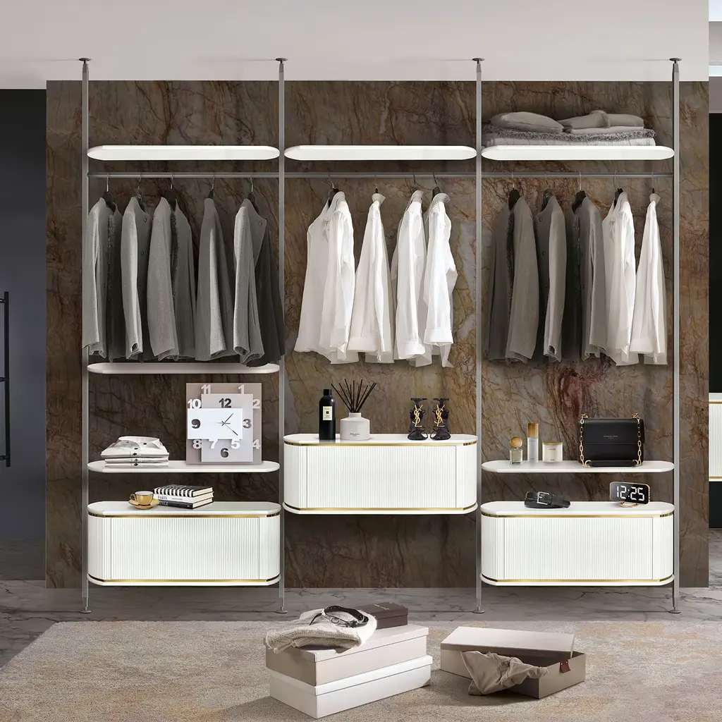 Designed to stand out with its suspended form, this wall sideboard combines polished white wood and gilded metal profiles for a sleek, contemporary look. The hinged door opens effortlessly with push-pull closure, maintaining its clean, linear aesthetic. Measuring 120 cm in width, it offers ample storage. Also available in 60cm and 90 cm sizes, it adapts seamlessly to spaces of varying dimensions.